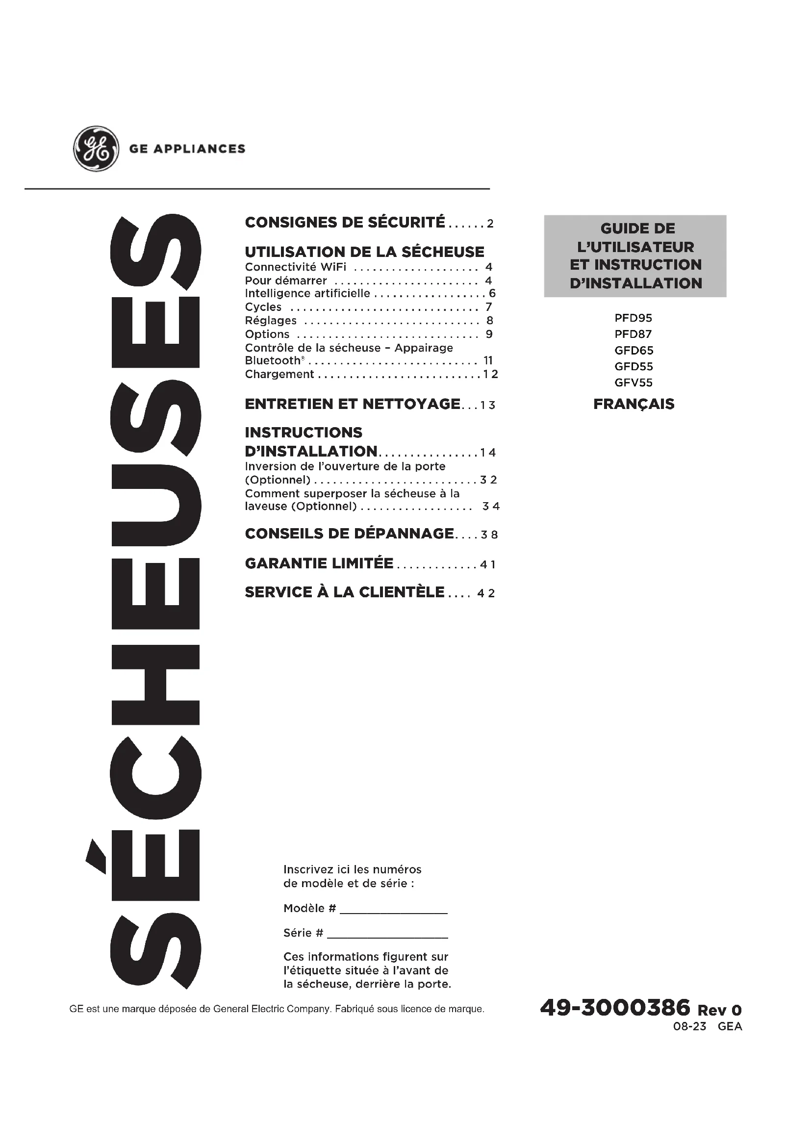 GUIDE DE L’UTILISATEUR ET INSTRUCTION D’INSTALLATION Inscrivez ici les numéros de modèle et de série : Modèle # ________________ Série # __________________ Ces informations figurent sur l’étiquette située à l’avant de la sécheuse, derrière la porte. FRANÇAIS 49-3000386 Rev 0 PFD95 PFD87 GFD65 GFD55 GFV552 49-3000386 Rev 0 LIRE ET