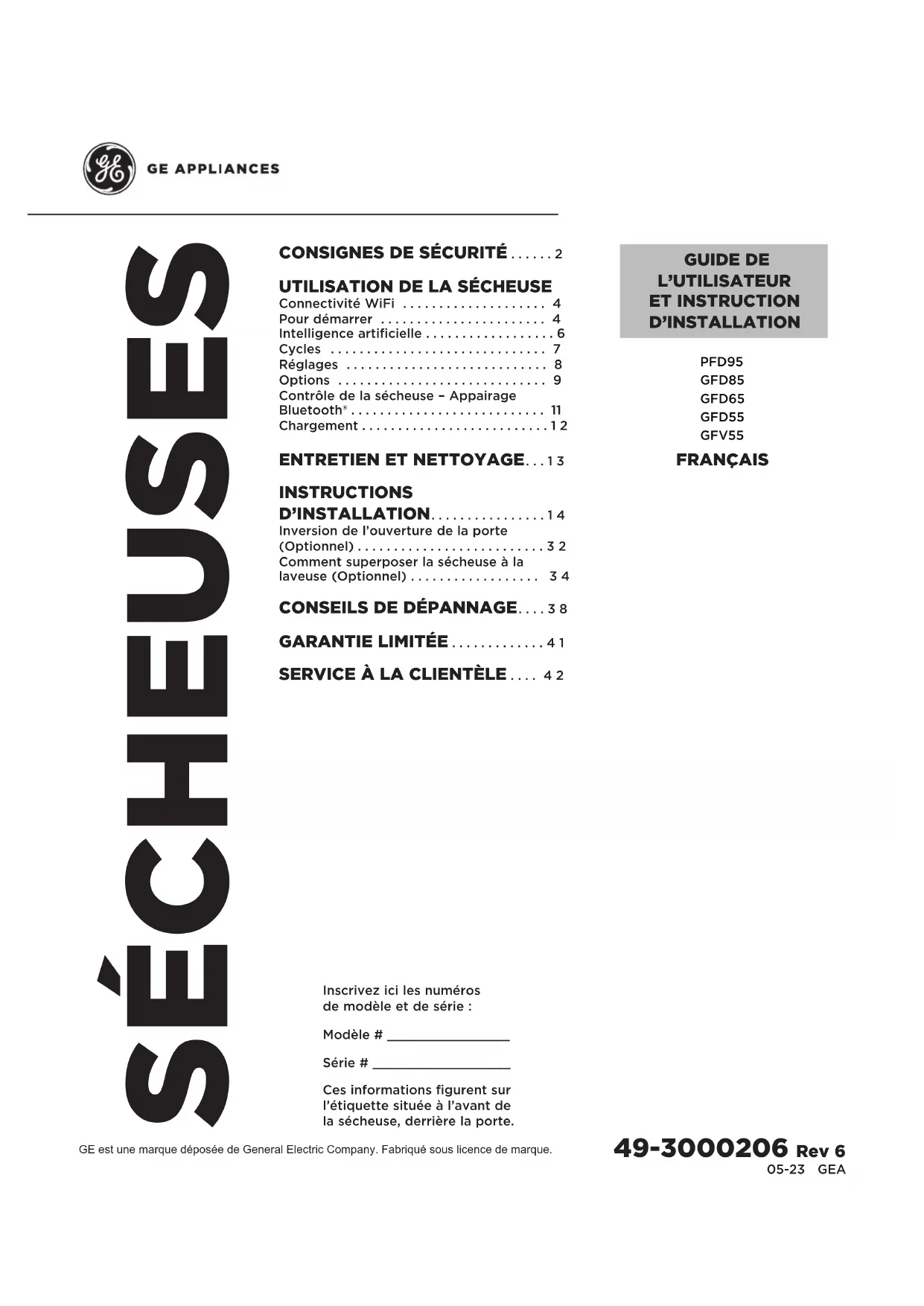 GUIDE DE L’UTILISATEUR ET INSTRUCTION D’INSTALLATION Inscrivez ici les numéros de modèle et de série : Modèle # ________________ Série # __________________ Ces informations figurent sur l’étiquette située à l’avant de la sécheuse, derrière la porte. FRANÇAIS 49-3000206 Rev 6 PFD95 GFD85 GFD65 GFD55 GFV552 49-3000206 Rev 6 LIRE ET