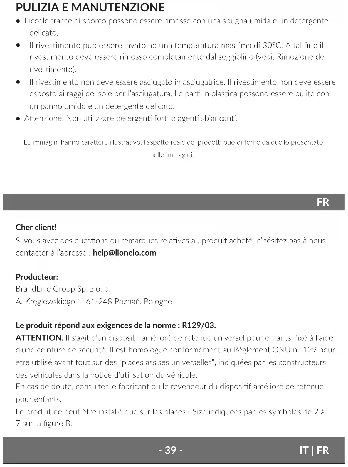 Cher client! Si vous avez des quesons ou remarques relaves au produit acheté, n’hésitez pas à nous contacter à l’adresse : help@lionelo.com Producteur: BrandLine Group Sp. z o. o. A. Kręglewskiego 1, 61-248 Poznań, Pologne Le produit répond aux exigences de la norme : R129/03. ATTENTION. Il s’agit d’un disposif amélioré de retenue universel pour enfants, xé à l’aide d’une ceinture de sécurité. Il est homologué conformément au Règlement ONU n° 129 pour être ulisé avant tout sur des “places assises universelles”, indiquées par les constructeurs des véhicules dans la noce d’ulisaon du véhicule. En cas de doute, consulter le fabricant ou le revendeur du disposif amélioré de retenue pour enfants. Le produit ne peut être installé que sur les places i-Size indiquées par les symboles de 2 à 7 sur la gure B. IT | FR‑ 40 ‑FR Le siège-auto peut être installé uniquement dos à la route à l’aide d’une ceinture de sécurité à trois points (g. B). Évitez d’installer le siège-auto sur les places où l’airbag frontal est acvé. Il est recommandé d’installer le siège-auto uniquement sur les sièges arrière du véhicule.