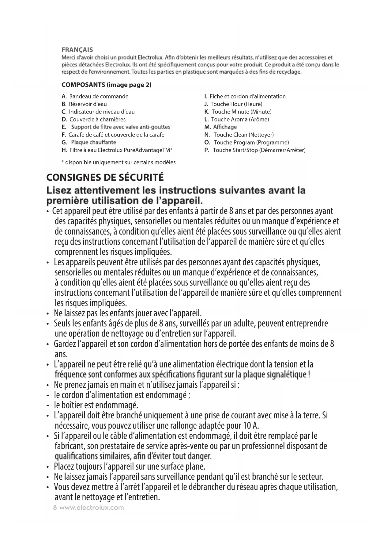 - Vous devez mettre à l’arrêt l’appareil et le débrancher du réseau après chaque utilisation, avant le nettoyage et l’entretien. 8 www.electrolux.com• L’appareil et les accessoires deviennent chauds pendant le fonctionnement. N’utilisez que les poignées et touches désignées. Laissez refroidir avant le nettoyage ou le stockage.