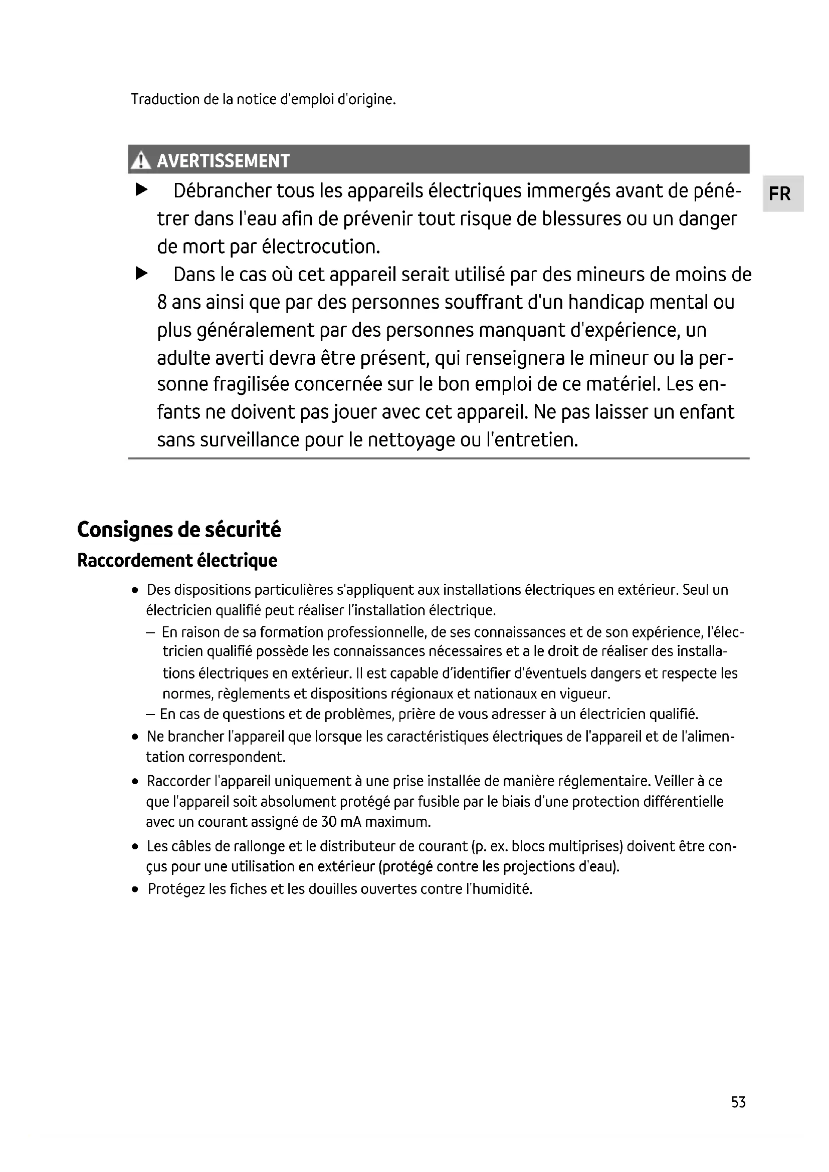 AVERTISSEMENT AVERTISSEMENT Débrancher tous les appareils électriques immergés avant de péné- trer dans l'eau afin de prévenir tout risque de blessures ou un danger de mort par électrocution. Dans le cas où cet appareil serait utilisé par des mineurs de moins de 8 ans ainsi que par des personnes souffrant d'un handicap mental ou plus généralement par des personnes manquant d'expérience, un adulte averti devra être présent, qui renseignera le mineur ou la per- sonne fragilisée concernée sur le bon emploi de ce matériel. Les en- fants ne doivent pas jouer avec cet appareil. Ne pas laisser un enfant sans surveillance pour le nettoyage ou l'entretien. Consignes de sécurité Raccordement électrique Des dispositions particulières s'appliquent aux installations électriques en extérieur. Seul un électricien qualifié peut réaliser l’installation électrique. – En raison de sa formation professionnelle, de ses connaissances et de son expérience, l'élec- tricien qualifié possède les connaissances nécessaires et a le droit de réaliser des installa- tions électriques en extérieur. Il est capable d’identifier d'éventuels dangers et respecte les normes, règlements et dispositions régionaux et nationaux en vigueur. – En cas de questions et de problèmes, prière de vous adresser à un électricien qualifié. Ne brancher l'appareil que lorsque les caractéristiques électriques de l'appareil et de l'alimen- tation correspondent. Raccorder l'appareil uniquement à une prise installée de manière réglementaire. Veiller à ce que l'appareil soit absolument protégé par fusible par le biais d’une protection différentielle avec un courant assigné de 30 mA maximum. Les câbles de rallonge et le distributeur de courant (p. ex. blocs multiprises) doivent être con- çus pour une utilisation en extérieur (protégé contre les projections d'eau). Protégez les fiches et les douilles ouvertes contre l'humidité.54 Exploitation sécurisée Ne pas utiliser l'appareil en cas d'endommagement des câbles électriques ou du boîtier. Jetez l'appareil si son câble de raccordement au secteur est endommagé. Le câble de raccor- dement au secteur ne peut pas être remplacé. Ne pas soulever ni tirer l'appareil par le câble électrique. Poser les câbles de manière à éviter tout risque d'endommagement et de trébuchement. Ne jamais procéder à des modifications techniques sur l'appareil. Exécuter des travaux sur l'appareil uniquement si ces derniers sont décrits dans la notice d'emploi. N’utiliser que des pièces de rechange et des accessoires d’origine. Utilisation conforme à la finalité Utilisez le produit décrit dans cette notice uniquement de la manière suivante : Pour le nettoyage de bassins de jardin, des piscines naturelles, des piscines et des aquariums. Dans le respect des caractéristiques techniques. (→ Caractéristiques techniques) Les restrictions suivantes sont valables pour l'appareil : Ce produit ne convient pas à l'éclairage général mais est uniquement destiné à l'usage décrit. Ne jamais utiliser la lampe UVC en dehors du boîtier, ni dans d'autres buts que ceux prévus normalement. Le rayonnement UVC est dangereux pour les yeux et la peau même à faibles doses. Ne jamais utiliser dans d'autres liquides que de l'eau. Ne jamais utiliser sans débit d'eau. Ne pas utiliser à des fins commerciales ou industrielles. Ne pas utiliser pour la stérilisation d'eau potable ou d'autres liquides. Ne pas utiliser en relation avec des produits chimiques, des produits alimentaires, des maté- riaux facilement inflammables ou explosifs.FR