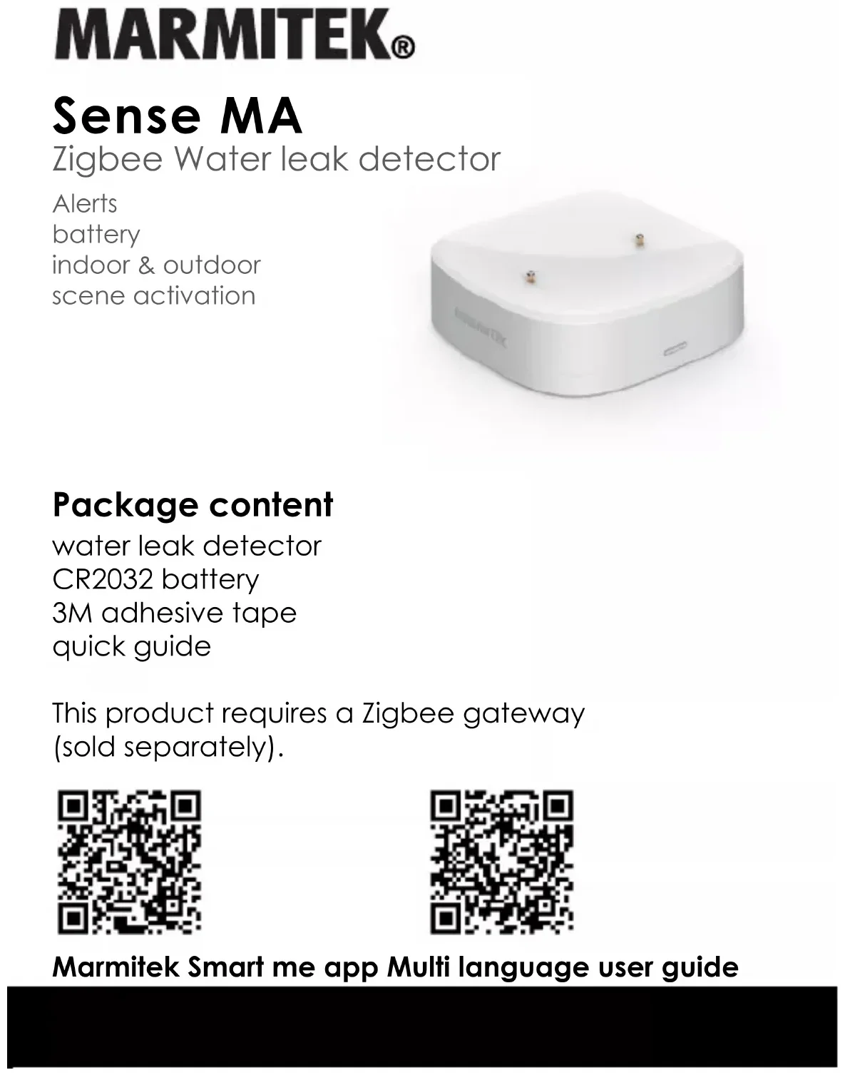Déclaration de conformité Marmitek BV déclare par la présente que le Sense MA est conforme aux exigences essentielles des directives 2014/53/EU. La déclaration de conformité complète est disponible sur www.marmitek.com/en/declarations-of-conformity/ Un manuel d'utilisation plus détaillé et des instructions sont disponibles sur notre site Web à l'adresse www.marmitek.com Water sensor Bouton de réinitialisation Témoin lumineux Bande de batteriesIndicaciones de seguridad Por favor, lea atentamente estas instrucciones antes de utilizar el dispositivo y guárdelas para futuras consultas.