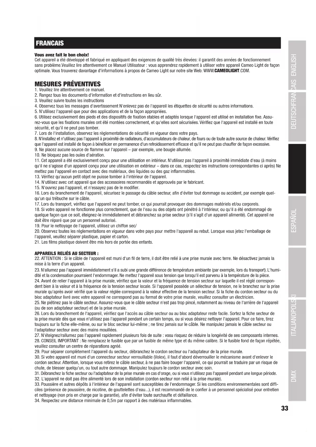 Nos conditions actuelles de garantie et de limitation de responsabilité sont disponibles à l‘adresse suivante : https://cdn-shop.adamhall.com/ media/pdf/MANUFACTURERS-DECLARATIONS_CAMEO.pdf. Pour les réparations, veuillez contacter Adam Hall GmbH, Adam-Hall-Str. 1, 61267 Neu Anspach / E-Mail Info@adamhall.com / +49 (0)6081 / 9419-0. TRI ET MISE AUX DÉCHETS CORRECTE DE CE PRODUIT (Valid in the European Union and other European countries with waste separation) (Applicable dans l‘Union Européenne et les autres pays européens pratiquant le tri des déchets) La présence de ce symbole sur le produit ou sur la documentation correspondante indique qu‘en fin de vie, le produit ne doit pas être jeté avec les déchets normaux, afin d‘éviter tout dommage à l‘environnement ou aux personnes consécutive à une élimination non contrôlée des déchets. Séparez-le des aut- res types de déchets et recyclez-le, afin de promouvoir la réutilisation durable des ressources naturelles. Nous conseillons aux utilisateurs non professionnels de contacter le revendeur chez qui ils ont acheté le produit, ou un représentant gouvernemental local, pour plus de détails sur le lieu de collecte et la façon de recycler cet appareil dans le meilleur respect de l‘environnement possible.. Nous invitons les utilisateurs professionnels à contacter leur fournisseur et à vérifier les termes et conditions de leur contrat d‘achat. Ce produit ne doit pas être mélangé à d‘autres déchets commerciaux lors de la collecte. Conformité CE La société Adam Hall GmbH déclare par la présente que ce produit est compatible avec les régulations suivantes (le cas échéant) : R&TTE (1999/5/EG) et RED (2014/53/EU) à partir de juin 2017 Directive basse tension (2014/35/EU) Directive CEM (2014/30/EU) RoHS (2011/65/EU) La Déclaration de Conformité complète est disponible sur le site Web www.adamhall.com. Pour toute information complémentaire, contactez-nous : info@adamhall.com.49 DMX DEUTSCHFRANCAIS ESPAÑOL ENGLISH ITALIANO POLSKI ESPAÑOL ¡GRACIAS POR ELEGIR CAMEO LIGHT! Este equipo está diseñado y fabricado con los estándares de calidad más exigentes, para garantizar un correcto funcionamiento durante muchos años.Lea atentamente este manual de usuario para poder aprovechar rápidamente toda la funcionalidad de su nuevo producto de Cameo Light. Más información sobre Cameo Light en la web WWW.CAMEOLIGHT.COM.