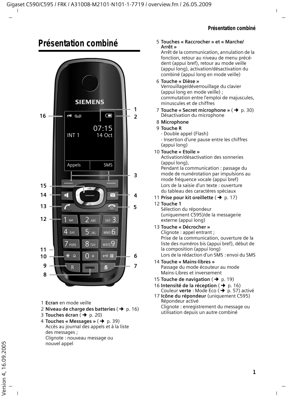 5 Touches « Raccrocher » et « Marche/ Arrêt » Arrêt de la communication, annulation de la fonction, retour au niveau de menu précédent (appui bref), retour au mode veille (appui long), activation/désactivation du combiné (appui long en mode veille) 6 Touche « Dièse » Verrouillage/déverrouillage du clavier (appui long en mode veille) ; commutation entre l'emploi de majuscules, minuscules et de chiffres p. 30) 7 Touche « Secret microphone » ( Désactivation du microphone 8 Microphone 9 Touche R - Double appel (Flash) - Insertion d'une pause entre les chiffres (appui long) 10 Touche « Etoile » Activation/désactivation des sonneries (appui long), Pendant la communication : passage du mode de numérotation par impulsions au mode fréquence vocale (appui bref) Lors de la saisie d'un texte : ouverture du tableau des caractères spéciaux 11 Prise pour kit oreillette ( p. 17) 12 Touche 1 Sélection du répondeur (uniquement C595)/de la messagerie externe (appui long) 13 Touche « Décrocher » Clignote : appel entrant ; Prise de la communication, ouverture de la liste des numéros bis (appui bref), début de la composition (appui long) Lors de la rédaction d'un SMS : envoi du SMS 14 Touche « Mains-libres » Passage du mode écouteur au mode Mains-Libres et inversement p. 19) 15 Touche de navigation ( p. 16) 16 Intensité de la réception ( Couleur verte : Mode Eco ( p. 57) activé 17 Icône du répondeur (uniquement C595) Répondeur activé Clignote : enregistrement du message ou utilisation depuis un autre combiné Ecran en mode veille p. 16) Niveau de charge des batteries ( Touches écran ( p. 20) p. 39) Touches « Messages » ( Accès au journal des appels et à la liste des messages ; Clignote : nouveau message ou nouvel appel