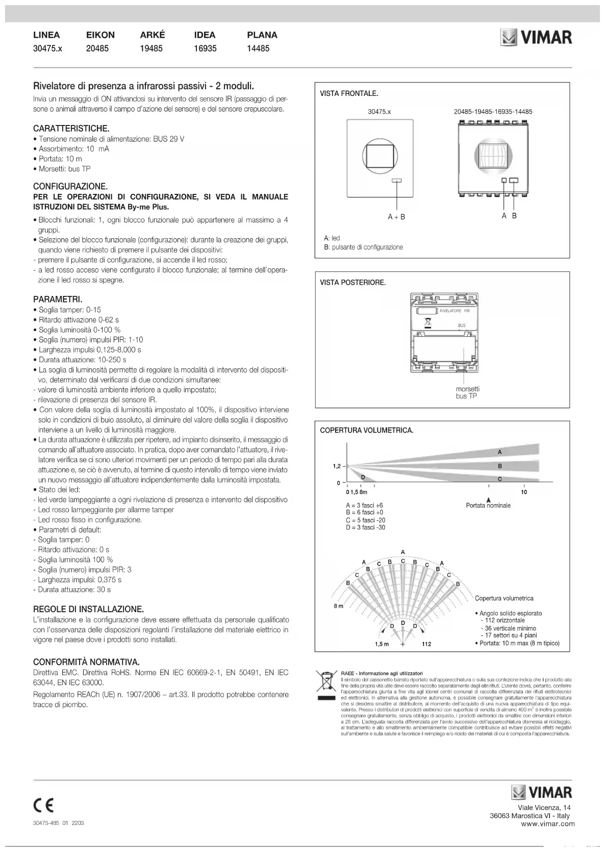 . La collecte séparée appropriée pour l’envoi successif de l’appareil en fin de vie au recyclage, au traitement et à l’élimi- nation dans le respect de l’environnement contribue à éviter les effets négatifs sur l’environnement et sur la santé et favorise le réemploi et/ou le recyclage des matériaux dont l’appareil est composé. VUE FRONTALE. A: led B: bouton de configuration A + B A B 30475.x20485-19485-16935-14485