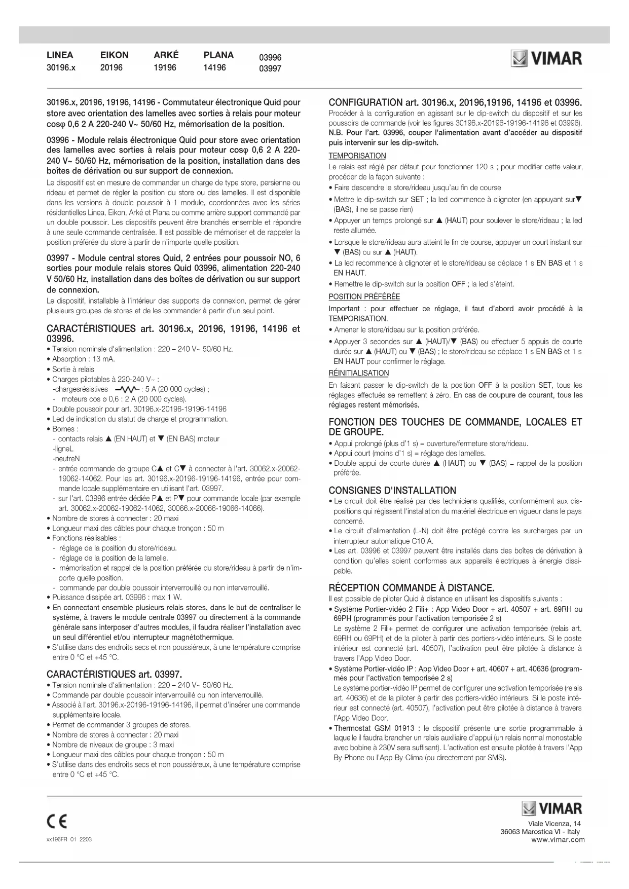 LINEA 30196.x 30196.x, 20196, 19196, 14196 - Commutateur électronique Quid pour store avec orientation des lamelles avec sorties à relais pour moteur cosφ 0,6 2 A 220-240 V~ 50/60 Hz, mémorisation de la position. 03996 - Module relais électronique Quid pour store avec orientation des lamelles avec sorties à relais pour moteur cosφ 0,6 2 A 220- 240 V~ 50/60 Hz, mémorisation de la position, installation dans des boîtes de dérivation ou sur support de connexion. Le dispositif est en mesure de commander un charge de type store, persienne ou rideau et permet de régler la position du store ou des lamelles. Il est disponible dans les versions à double poussoir à 1 module, coordonnées avec les séries résidentielles Linea, Eikon, Arké et Plana ou comme arrière support commandé par un double poussoir. Les dispositifs peuvent être branchés ensemble et répondre à une seule commande centralisée. Il est possible de mémoriser et de rappeler la position préférée du store à partir de n’importe quelle position. 03997 - Module central stores Quid, 2 entrées pour poussoir NO, 6 sorties pour module relais stores Quid 03996, alimentation 220-240 V 50/60 Hz, installation dans des boîtes de dérivation ou sur support de connexion. Le dispositif, installable à l’intérieur des supports de connexion, permet de gérer plusieurs groupes de stores et de les commander à partir d’un seul point. CARACTÉRISTIQUES art. 30196.x, 20196, 19196, 14196 et