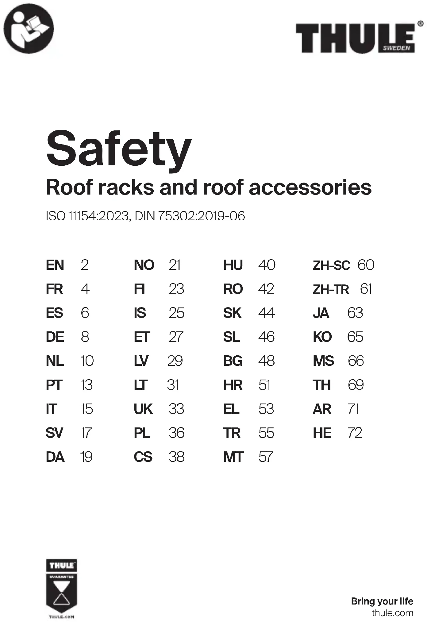 Important - Lisez attentivement ces instructions et conservez-les pour référence future. AVERTISSEMENT Le non-respect des instructions peut entraîner une mauvaise utilisation du produit, pouvant provoquer des dommages ou des blessures corporelles. A.0 Installation A.1 Vérifier avec les «Instructions de montage» que toutes les pièces sont présentes dans l’emballage. A.2 N’installez pas les barres de toit Thule sur une partie du véhicule qui a été modifiée de toute autre manière. A.3 Laver et essuyer le toit de la voiture ainsi que les parties du produit en contact avec celui-ci. A.4 Lire attentivement les instructions de montage et respecter l’ordre des schémas explicatifs lors de l’installation du produit; si une liste d’affectation est incluse ne pas oublier de la consulter. A.5 Si aucune indication n’est précisée sur le positionnement des barres sur toit, essayer de maintenir un écartement minimum de 700 mm entre les deux barres. A.6 Pour le transport d’objets longs l’écartement entre les barres ne doit pas être inférieur à 600 mm. A.7 Avant chaque utilisation vérifier que les barres sont solidement fixées sur le toit, en les secouant pour essayer de les faire bouger. Vérifier qu’il est impossible d’arracher les pattes de fixation; si ce n’est pas le cas, il est alors nécessaire de resserrer plus fermement les barres. Répéter ces tests régulièrement. A.8 Certains toits ouvrants ou antennes ne pourront être utilisés lorsque les barres de toit sont fixées sur la voiture A.9 Le montage d’une barre de toit sur une voiture dotée d’un toit en verre est autorisée, sauf indication contraire dans les instructions de montage. A.10 Le fabricant ne peut être tenu responsable en cas de dommage personnel ou perte causé par une installation ou une utilisation incorrecte du produit.55560060001 A.11 Ce produit ne doit subir aucune modification. A.12 Consultez votre revendeur pour toute question relative au fonctionnement et aux limites des produits. Examinez attentivement toutes les instructions et informations de garantie. A.13 N’ignorez pas les lois et réglementations du pays dans lequel vous prévoyez d’utiliser le produit. A.14 Vérifiez toujours que les barres de toit ou les autres accessoires de toitn’interfèrent pas avec tout type de toit ouvrant vitré/panoramique/solaire. B.0 Chargement B.1 Ne pas dépasser la charge maxi indiquée dans les instructions de montage. Vérifier toutefois que le constructeur auto ne spécifie pas une charge inférieure, auquel cas cette dernière prévaut. Charge maxi sur le toit = Poids: des barres de toit + Accessoires éventuels + Chargement. B.2 Garder à l’esprit que latéralement, le chargement ne doit pas dépasser par rapport aux barres de toit; par ailleurs le chargement doit être réparti de manière homogène sur les barres, en recherchant le cen tre de gravité le plus bas possible. B.3 Lors du transport de plusieurs planches de surf, elles doivent êtres placées les unes sur les autres et non pas les unes à coté des autres. B.4 Lors du transport d’objets longs type planches à voiles ou autres, il est nécessaire de les fixer à l’avant et à l’arrière de la voiture. B.5 Les skis doivent être transportés avec les spatules vers l’arrière. B.6 Ne pas oublier d’enlever les accessoires susceptibles de se détacher du matériel transporter, ainsi sur les vélos: les sièges pour enfants, pompes, gourdes… B.7 Le chargement doit être solidement fixé avec des sangles; ne pas utiliser tendeurs et autres sandows. B.8 Contrôler la fixation du chargement après plusieurs kilomètres, puis à intervalles réguliers en resserrant si nécessaire. ATTENTION! Toujours vérifier la fixation du chargement. C.0 Conduite et Réglementation C.1 La vitesse du véhicule doit constament être ajustée en fonction du chargement transporté et des conditions de route, telles que le type et la qualité de la route, les conditions météorologiques, l’intensité du trafic et les limitations de vitesse en vigueur, mais ne doit en aucun cas dépasser 130 km/h. Les limitations de vitesse applicables et l’ensemble de la législation routière en vigueur doivent toujours être observées. C.2 Roulez lentement sur les dos d’âne, à une vitesse maximum de 10 km/h. C.3 Attention, à la hauteur du véhicule notamment lors du transport de vélos sur les barres de toit.6 5560060001 C.4 Un chargement sur le toit modifie la tenue de route et le freinage du véhicule, ainsi que la sensibilité à la prise au vent latéral. C.5 Les produits livrés avec des verrous doivent être systématiquement fermés à clé lors du transport. C.6 Adaptez votre vitesse aux conditions de route et au chargement transporté. Contrôlez régulièrement la tension du chargement, surtout sivous voyagez sur des routes accidentées. D.0 Entretien D.1 Contrôler et remplacer les pièces défectueuses le cas échéant. D.2 Nettoyer et entretenir les barres de toit avec soin notamment en hiver. D.3 Démonter les barres de toit lorsqu’elles ne servent pas. D.4 Ranger et conserver soigneusement toutes les pièces des barres lorsqu’elles sont démontées.