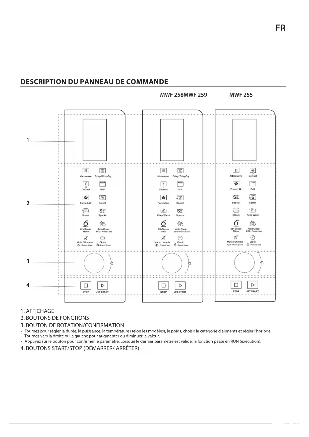 OVEN SAFE DISHMENU VAPEUR (MWF 255 ET MWF 259 UNIQUEMENT) Cette fonction vous permet d'obtenir des plats au goût sain et naturel en cuisinant à la vapeur. Utilisez cette fonction pour cuire à la vapeur les aliments comme les pâtes, le riz, les légumes et le poisson. Il vous est demandé de régler le temps d'ébullition du riz et des pâtes en fonction des recommandations de l’emballage alimentaire. Par exemple, pour faire bouillir 4 portions de quinoa, utilisez le cuiseur vapeur sans grille. VOYANTS : Steamer with Grid Steamer w/o Grid MICROWAVE Conseils et suggestions: