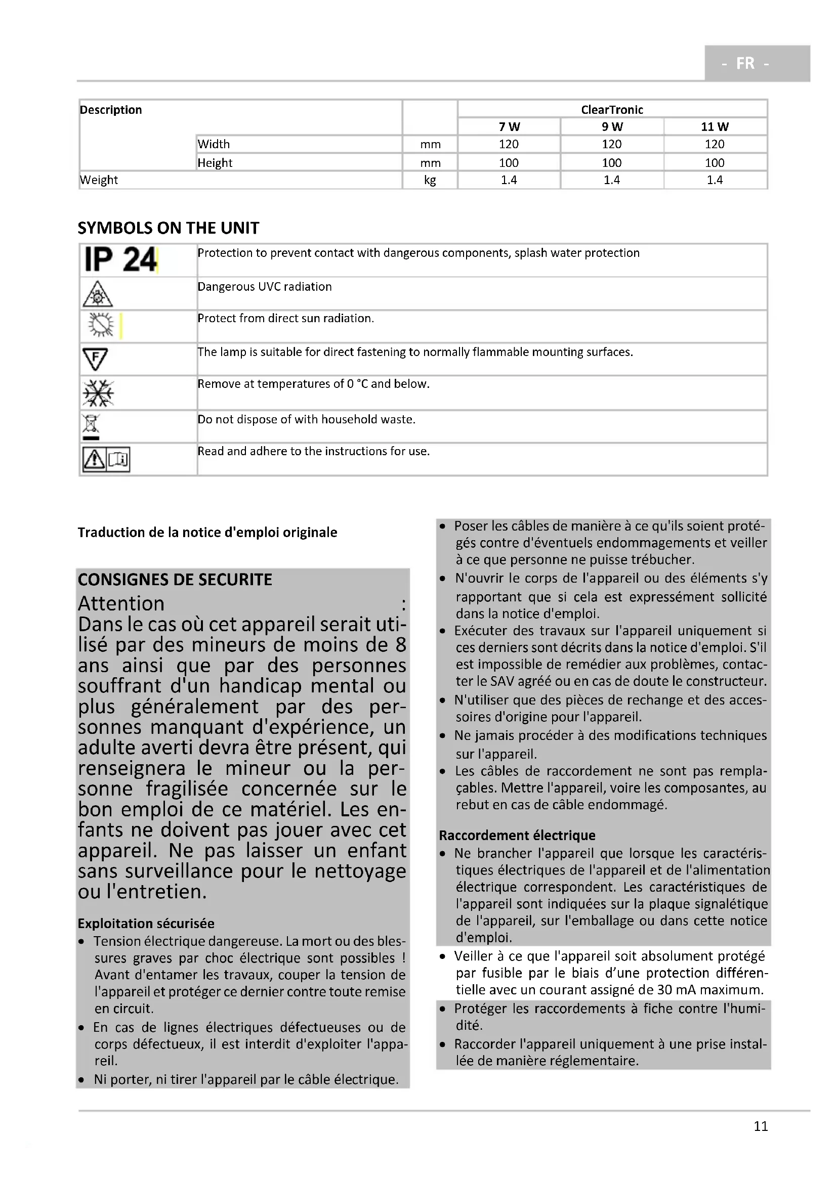 Description des fonctions Le rayonnement particulier de l'appareil d'épuration UVC élimine les algues et autres matières en suspen- sion donnant une coloration trouble verte à l'eau. De plus ce rayonnement détruit les bactéries et les germes. L'appareil de clarification UVC s'intègre dans le circuit d'eau, de manière idéale en amont d'un filtre. Utilisation conforme à la finalité ClearTronic 7 W / 9 W / 11 W, appelé par la suite «ap- pareil», doit être utilisé exclusivement comme suit :