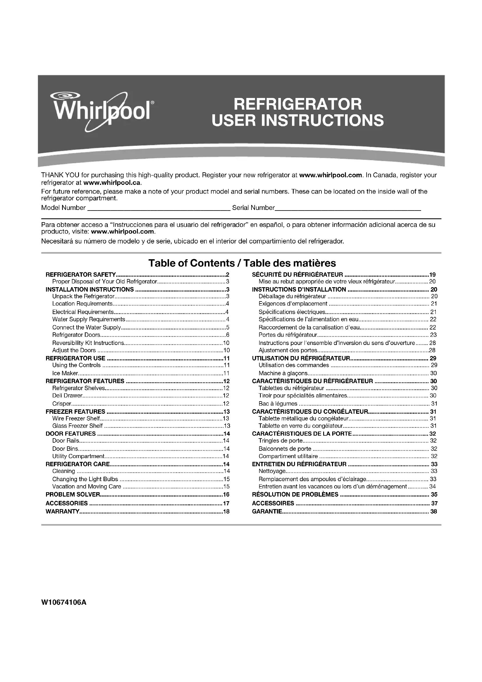 enlevés, modifiés ou ne peuvent pas être facilement identifiés. Le coût d’une réparation ou d’un remplacement dans le cadre de ces circonstances exclues est à la charge du client. CLAUSE D'EXONÉRATION DE RESPONSABILITÉ AU TITRE DES GARANTIES IMPLICITES LES GARANTIES IMPLICITES, Y COMPRIS LES GARANTIES APPLICABLES DE QUALITÉ MARCHANDE OU D'APTITUDE À UN USAGE PARTICULIER, SONT LIMITÉES À UN AN OU À LA PLUS COURTE PÉRIODE AUTORISÉE PAR LA LOI. Certains États et provinces ne permettent pas de limitation sur la durée des garanties implicites de qualité marchande ou d'aptitude à un usage particulier, de sorte que la limitation ci-dessus peut ne pas être applicable dans votre cas. Cette garantie vous confère des droits juridiques spécifiques et vous pouvez également jouir d’autres droits qui peuvent varier d’une juridiction à l'autre. EXONÉRATION DE RESPONSABILITÉ DANS LES DOMAINES NON COUVERTS PAR LA GARANTIE Whirlpool décline toute responsabilité au titre de la qualité, de la durabilité ou en cas de dépannage ou de réparation nécessaire sur ce gros appareil ménager autre que les responsabilités énoncées dans la présente garantie. Si vous souhaitez une garantie plus étendue ou plus complète que la garantie limitée fournie avec ce gros appareil ménager, adressez-vous à Whirlpool ou à votre détaillant pour obtenir les modalités d'achat d'une garantie étendue. LIMITATION DES RECOURS; EXCLUSION DES DOMMAGES FORTUITS OU INDIRECTS LE SEUL ET EXCLUSIF RECOURS DU CLIENT DANS LE CADRE DE LA PRÉSENTE GARANTIE LIMITÉE CONSISTE EN LA RÉPARATION PRÉVUE PAR LA PRÉSENTE. WHIRLPOOL N’ASSUME AUCUNE RESPONSABILITÉ POUR LES DOMMAGES FORTUITS OU INDIRECTS. Certains États et certaines provinces ne permettent pas l’exclusion ou la limitation des dommages fortuits ou indirects de sorte que ces limitations et exclusions peuvent ne pas être applicables dans votre cas. Cette garantie vous confère des droits juridiques spécifiques et vous pouvez également jouir d’autres droits qui peuvent varier d’une juridiction à l'autre. W10674106A