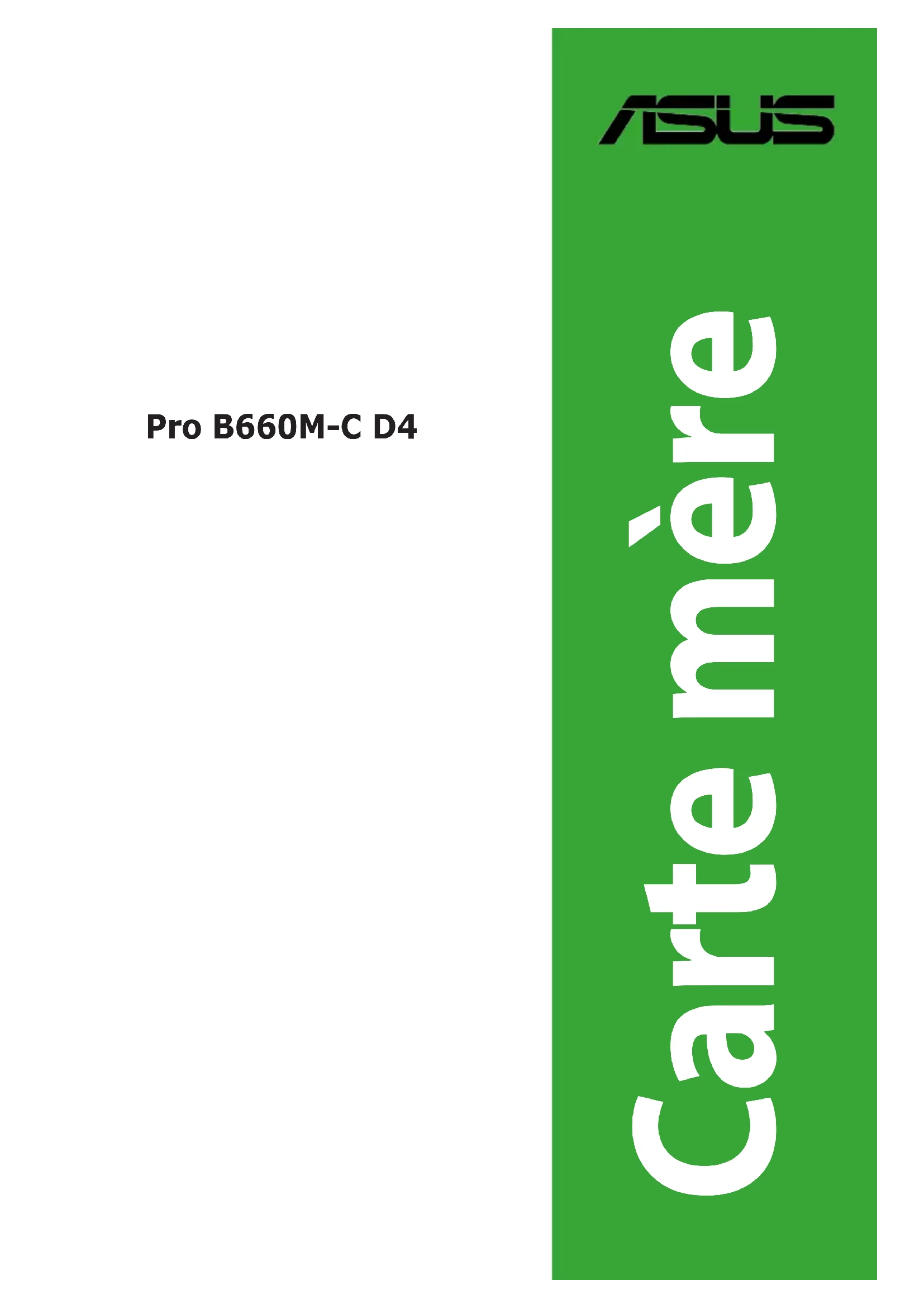 *** Prend en charge la résolution 4K@60Hz comme déni dans les spécications HDMI™ 2.1. Slots d'extension Processeurs Intel® de 12e génération 1x Slot PCIe 4.0/3.0 x16 Chipset Intel® B660 2 x Slots PCIe 3.0 x1 (continue à la page suivante) Contenu de la boîte Vériez la présence des éléments suivants dans l'emballage de votre carte mère. Carte mère 1 x Carte mère Pro B660M-C D4 Câbles 2 x Câbles SATA 6 Gb/s Divers 1 x Cache E/S 1 x Kit de vis pour SSD M.2 1 x Kit de vis E Key M.2 Support d’installation 1 x DVD de support Documentation 1 x Carte d'activation ACC Express (Asus Control Center Express) 1 x Manuel de l'utilisateur Si l'un des éléments ci-dessus est endommagé ou manquant, veuillez contacter votre revendeur.vii Résumé des caractéristiques de la Pro B660M-C D4 Stockage 2 x Slots M.2 et 4 x Ports SATA 6 Gb/s* Processeurs Intel® de 12e génération Slot M.2_1 pour lecteurs M Key 2242/2260/2280 - Les processeurs Intel® de 12e génération prennent en charge le mode PCIe 4.0 x4 Chipset Intel® B660** Slot M.2_2 pour lecteurs M Key 2242/2260/2280 (Mode PCIe 4.0 x4) 4 x Connecteurs SATA 6.0 Gb/s *Prise en charge des congurations RAID 0/1/5/10 avec Intel® Rapid Storage Technology. **Intel® Rapid Storage prend en charge la mémoire Intel® Optane™ série H sur les slots M.2 du PCH. Réseau 1 x Contrôleur Ethernet Intel® 1Gb ASUS LANGuard Sans l et Bluetooth Slot M.2 uniquement (E Key, interfaces CNVi et PCIe)* *Le module WiFi est vendu séparément. USB USB sur panneau E/S arrière (4 ports au total) 2 x Ports USB 3.2 Gen 1 (2 x Type-A) 2 x Ports USB 2.0 (2 x Type-A) USB en façade (7 ports au total) 1 x Connecteur USB 3.2 Gen 1 (compatible USB Type-C®) 1 x Connecteur USB 3.1 Gen 1 (pour 2 ports USB 3.1 Gen 1 supplémentaires) 2 x Connecteurs USB 2.0 (pour 4 ports USB 2.0 supplémentaires) Audio CODEC HD Audio Realtek® 7.1 Surround* - Prise en charge de la détection et de la réaectation (en façade uniquement) des prises audio - Prend en charge jusqu'à 24 bits / 192 kHz