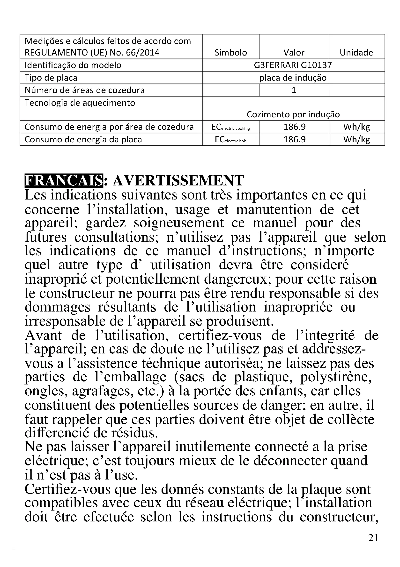 FRANCAIS: AVERTISSEMENT Les indications suivantes sont très importantes en ce qui concerne l’installation, usage et manutention de cet appareil; gardez soigneusement ce manuel pour des futures consultations; n’utilisez pas l’appareil que selon les indications de ce manuel d’instructions; n’importe quel autre type d’ utilisation devra être consideré inaproprié et potentiellement dangereux; pour cette raison le constructeur ne pourra pas être rendu responsable si des dommages résultants de l’utilisation inapropriée ou irresponsable de l’appareil se produisent. Avant de l’utilisation, certifiez-vous de l’integrité de l’appareil; en cas de doute ne l’utilisez pas et addressez- vous a l’assistence téchnique autoriséa; ne laissez pas des parties de l’emballage (sacs de plastique, polystirène, ongles, agrafages, etc.) à la portée des enfants, car elles constituent des potentielles sources de danger; en autre, il faut rappeler que ces parties doivent être objet de collècte differencié de résidus. Ne pas laisser l’appareil inutilemente connecté a la prise eléctrique; c’est toujours mieux de le déconnecter quand il n’est pas à l’use. Certifiez-vous que les donnés constants de la plaque sont compatibles avec ceux du réseau eléctrique; l’installation doit être efectuée selon les instructions du constructeur, Medições e cálculos feitos de acordo com REGULAMENTO (UE) No. 66/2014