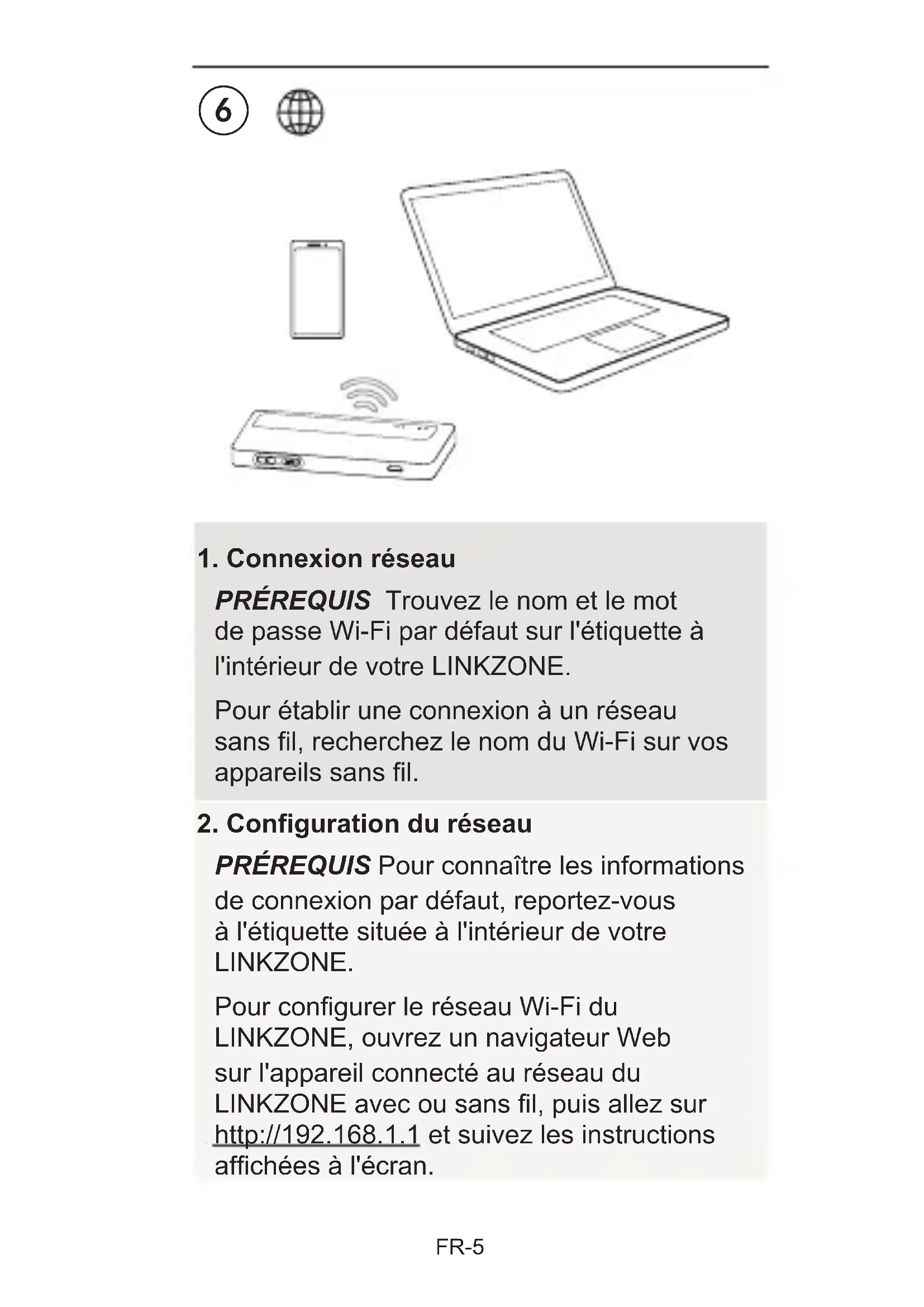 PRÉREQUISPourconnaîtrelesinformations deconnexionpardéfaut,reportez-vous àl'étiquettesituéeàl'intérieurdevotre LINKZONE. PourcongurerleréseauWi-Fidu LINKZONE,ouvrezunnavigateurWeb surl'appareilconnectéauréseaudu LINKZONEavecousansl,puisallezsur http://192.168.1.1etsuivezlesinstructions afchéesàl'écran.FR-6 Informations importantes sur la sécurité Liseztouteslesinformationsrelativesàla sécuritéavantd’utiliservotreappareil.Le non-respectdecesconsignesdesécuritépeut entraînerdesblessuresoudesdommages àvotreappareilouàd’autresbiens.Le fabricantnepourraêtretenuresponsable desconséquencesrésultantd’uneutilisation impropreet/ounonconformeauxinstructions contenuesdanslemanuel. Instructions de sécurité et de manipulation