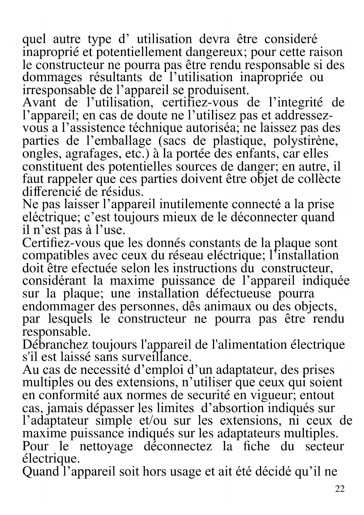 Wh/kg22 quel autre type d’ utilisation devra être consideré inaproprié et potentiellement dangereux; pour cette raison le constructeur ne pourra pas être rendu responsable si des dommages résultants de l’utilisation inapropriée ou irresponsable de l’appareil se produisent. Avant de l’utilisation, certifiez-vous de l’integrité de l’appareil; en cas de doute ne l’utilisez pas et addressez- vous a l’assistence téchnique autoriséa; ne laissez pas des parties de l’emballage (sacs de plastique, polystirène, ongles, agrafages, etc.) à la portée des enfants, car elles constituent des potentielles sources de danger; en autre, il faut rappeler que ces parties doivent être objet de collècte differencié de résidus. Ne pas laisser l’appareil inutilemente connecté a la prise eléctrique; c’est toujours mieux de le déconnecter quand il n’est pas à l’use. Certifiez-vous que les donnés constants de la plaque sont compatibles avec ceux du réseau eléctrique; l’installation doit être efectuée selon les instructions du constructeur, considérant la maxime puissance de l’appareil indiquée sur la plaque; une installation défectueuse pourra endommager des personnes, dês animaux ou des objects, par lesquels le constructeur ne pourra pas être rendu responsable. Débranchez toujours l'appareil de l'alimentation électrique s'il est laissé sans surveillance. Au cas de necessité d’emploi d’un adaptateur, des prises multiples ou des extensions, n’utiliser que ceux qui soient en conformité aux normes de securité en vigueur; entout cas, jamais dépasser les limites d’absortion indiqués sur l’adaptateur simple et/ou sur les extensions, ni ceux de maxime puissance indiqués sur les adaptateurs multiples. Pour le nettoyage déconnectez la fiche du secteur électrique. Quand l’appareil soit hors usage et ait été décidé qu’il ne23 sera pas reparé, on reccomande son inutilisation, en coupant son câble d’alimentation. - Ne pas approcher le câble d’alimentation d’objects coupants ou de surfaces chaudes, et ne pas tirer sur le cordon d’alimentation pour le débrancher de la prise. Ne le laissez pas pendre du plan de travail où un enfant pourrait le tenir. - Ne pas utiliser l’appareil si le câble d’alimentation ou la fiche de connéction eléctrique sont endommagés, ou encore en cas de court-circuits; dans ce cas là, apporter l’appareil a un centre d’assistence autorisé. - L’appareil n’est pas indiqué pour être exposé à des conditions météorologiques défavorables (pluie, vent, humidité, la glace, etc.); Gardez-le dans un endroit sec. Jamais opérer ou même toucher l’appareil avec les mains mouillées ou les pieds nus. - Cet appareil peut être utilisé par des enfants agés de plus de 8 ans et par des personnes avec une réduite capacité phisique, sensorial ou mental, ou encore avec peu d’expérience à son usage, pourvu qu’une supervision adéquate leur en soit assuré, ou s’ils auraient été instruits à l’usage de l’appareil en complete securité. Les opérations de nettoyage e de manutention ne oivent pás être efectués par des enfants, sauf pour ceux qui sont agés de plus de 8 ans et sont supervisionés. - Gardez l’appareil et le câble d’alimentation hors la portée des enfants agés de moins de 8 ans. Si le câble d'alimentation est endommagé ou en cas de panne et / ou de dysfonctionnement, ne modifiez pas l'appareil. Toute réparation doit être effectuée par le fabricant ou par son service d'assistance technique ou, en tout cas, par une personne possédant une qualification similaire, afin d'éviter tout risque. Le non-respect de ce qui précède peut compromettre la sécurité de l'appareil et invalider les conditions de la garantie.24 ATTENTION: Cet appareil comporte une fonction de chauffage. Quelques surfaces, même si non la plaque elle même, pourront atteindre des températures élevées. Étant donné que la sensibilité à la température diffère de personne à personne, cet appareil devrà être usé avec PRUDENCE. Placez l’appareil sur des surfaces adéhrentes et préparées pour cet effet, et utilisez les mésures de protection contre la chaleur conseillées. - Les enfants ne doivent pas jouer avec cet appareil. - Cet appareil est destiné à être utilisé dans les ménages et des applications similaires: les cuisines du personnel dans les magasins, bureaux et autres environnements de travail, pour les clients dans les hôtels, motels et autres environnements de type résidentiel, de type lit et petit- déjeuner, hébergement. - L’appareil n’est pas conçu pour être utilisé avec une minuterie extérieure ou un commande à distance. - N’utiliser que des accéssoires e pièces d’origine. - ATTENTION: Fonctionnement à induction. Ne pas utiliser sur des tables ou des surfaces en métal. - Avant chaque utilisation, effectuez le cordon d'alimentation. Ne soumettez pas le produit à des chocs susceptibles de l'endommager. - Tenir l’appareil à l’écart des environnements où il peut y avoir des gaz, vapeurs, des substances inflammables ou explosives. ATTENTION, RISQUE D'INCENDIE: Ne pas utiliser pour quelque raison que ce soit sur: - tables ou surfaces métalliques - plaques de cuisson ou poêles - réfrigérateurs et congélateurs dans le cockpit - autres surfaces à âme métallique Le fonctionnement par induction, tout en chauffant la casserole, pourrait également chauffer la surface de support métallique, la rendant dans certains cas25 incandescente. Avant d'utiliser l'appareil, vérifiez également qu'il n'y a pas d'objets métalliques en dessous.