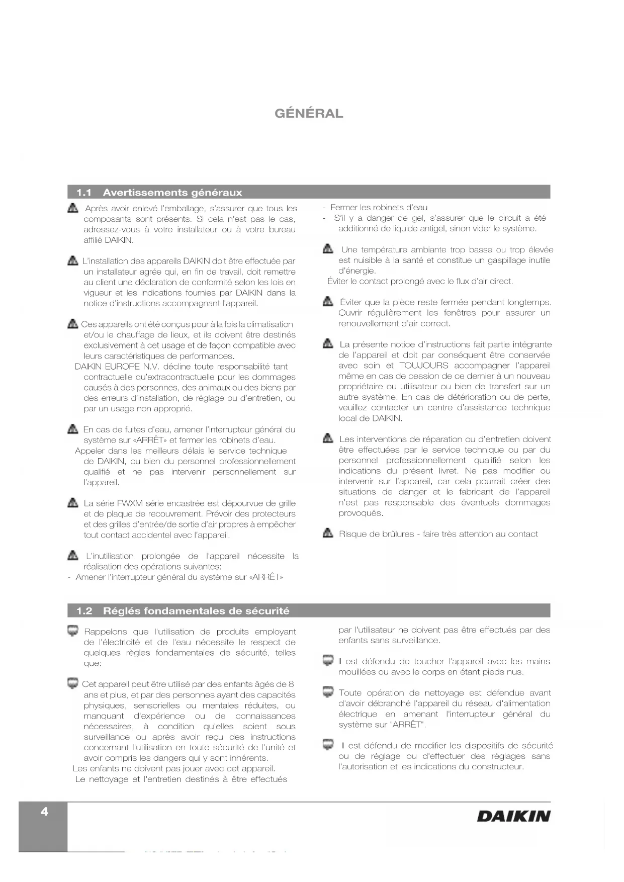 Avertissements généraux Réglés fondamentales de sécurité Après avoir enlevé l’emballage, s’assurer que tous les composants sont présents. Si cela n’est pas le cas, adressez-vous à votre installateur ou à votre bureau affilié DAIKIN. L’installation des appareils DAIKIN doit être effectuée par un installateur agrée qui, en fin de travail, doit remettre au client une déclaration de conformité selon les lois en vigueur et les indications fournies par DAIKIN dans la notice d’instructions accompagnant l’appareil. Ces appareils ont été conçus pour à la fois la climatisation et/ou le chauffage de lieux, et ils doivent être destinés exclusivement à cet usage et de façon compatible avec leurs caractéristiques de performances. DAIKIN EUROPE N.V. décline toute responsabilité tant contractuelle qu’extracontractuelle pour les dommages causés à des personnes, des animaux ou des biens par des erreurs d’installation, de réglage ou d’entretien, ou par un usage non approprié. En cas de fuites d’eau, amener l’interrupteur général du système sur «ARRÊT» et fermer les robinets d’eau. Appeler dans les meilleurs délais le service technique de DAIKIN, ou bien du personnel professionnellement qualifié et ne pas intervenir personnellement sur l’appareil. La série FWXM série encastrée est dépourvue de grille et de plaque de recouvrement. Prévoir des protecteurs et des grilles d’entrée/de sortie d’air propres à empêcher tout contact accidentel avec l’appareil. L’inutilisation prolongée de l’appareil nécessite la réalisation des opérations suivantes: - Amener l’interrupteur général du système sur «ARRÊT» - Fermer les robinets d’eau - S’il y a danger de gel, s’assurer que le circuit a été additionné de liquide antigel, sinon vider le système. Une température ambiante trop basse ou trop élevée est nuisible à la santé et constitue un gaspillage inutile d’énergie. Éviter le contact prolongé avec le flux d’air direct. Éviter que la pièce reste fermée pendant longtemps. Ouvrir régulièrement les fenêtres pour assurer un renouvellement d’air correct. La présente notice d’instructions fait partie intégrante de l’appareil et doit par conséquent être conservée avec soin et TOUJOURS accompagner l’appareil même en cas de cession de ce dernier à un nouveau propriétaire ou utilisateur ou bien de transfert sur un autre système. En cas de détérioration ou de perte, veuillez contacter un centre d’assistance technique local de DAIKIN. Les interventions de réparation ou d’entretien doivent être effectuées par le service technique ou par du personnel professionnellement qualifié selon les indications du présent livret. Ne pas modifier ou intervenir sur l’appareil, car cela pourrait créer des situations de danger et le fabricant de l’appareil n’est pas responsable des éventuels dommages provoqués. Risque de brûlures - faire très attention au contact Rappelons que l'utilisation de produits employant de l'électricité et de l'eau nécessite le respect de quelques règles fondamentales de sécurité, telles que: Cet appareil peut être utilisé par des enfants âgés de 8 ans et plus, et par des personnes ayant des capacités physiques, sensorielles ou mentales réduites, ou manquant d'expérience ou de connaissances nécessaires, à condition qu'elles soient sous surveillance ou après avoir reçu des instructions concernant l'utilisation en toute sécurité de l'unité et avoir compris les dangers qui y sont inhérents. Les enfants ne doivent pas jouer avec cet appareil. Le nettoyage et l'entretien destinés à être effectués par l'utilisateur ne doivent pas être effectués par des enfants sans surveillance. Il est défendu de toucher l'appareil avec les mains mouillées ou avec le corps en étant pieds nus. Toute opération de nettoyage est défendue avant d'avoir débranché l'appareil du réseau d'alimentation électrique en amenant l'interrupteur général du système sur "ARRÊT". Il est défendu de modifier les dispositifs de sécurité ou de réglage ou d'effectuer des réglages sans l'autorisation et les indications du constructeur.