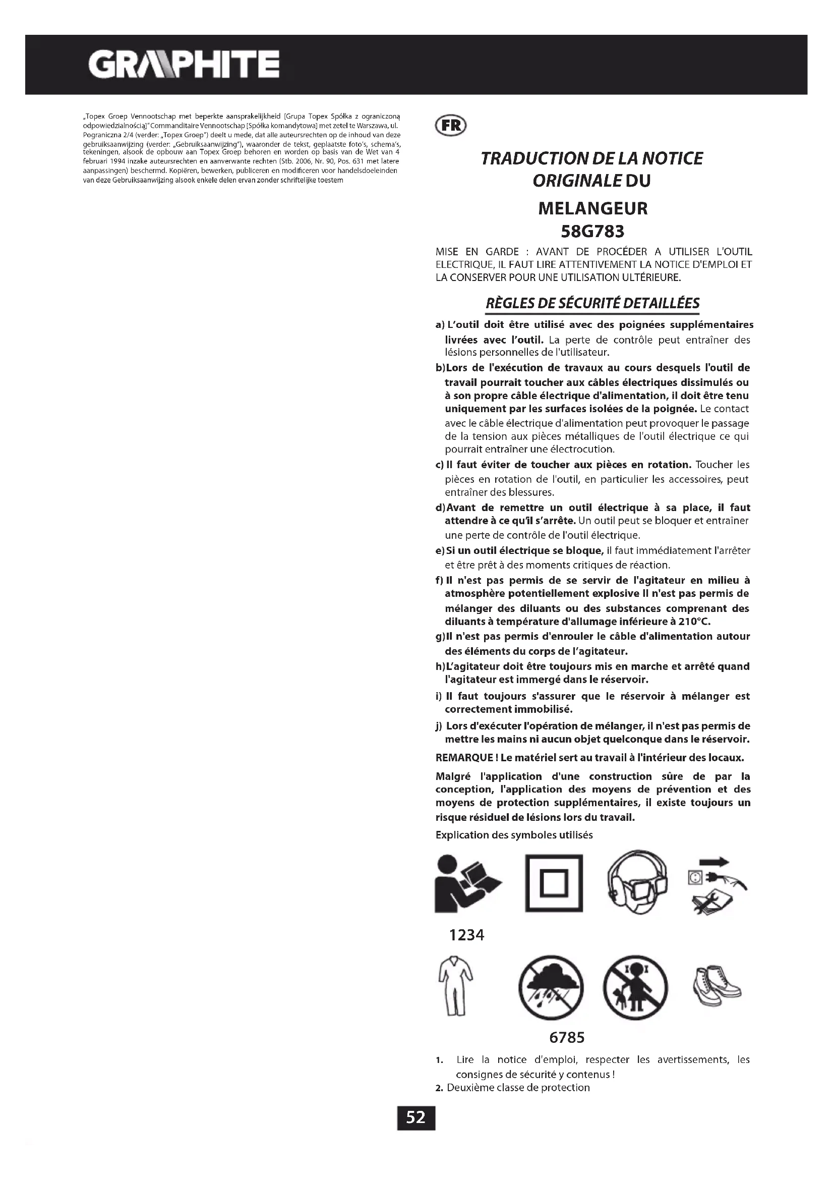 ORIGINALE DU MELANGEUR 58G783 MISE EN GARDE : AVANT DE PROCÉDER A UTILISER L'OUTIL ELECTRIQUE, IL FAUT LIRE ATTENTIVEMENT LA NOTICE D'EMPLOI ET LA CONSERVER POUR UNE UTILISATION ULTÉRIEURE. RÈGLES DE SÉCURITÉ DETAILLÉES a) L’outil doit être utilisé avec des poignées supplémentaires livrées avec l’outil. La perte de contrôle peut entraîner des lésions personnelles de l'utilisateur. b) Lors de l'exécution de travaux au cours desquels l'outil de travail pourrait toucher aux câbles électriques dissimulés ou à son propre câble électrique d'alimentation, il doit être tenu uniquement par les surfaces isolées de la poignée. Le contact avec le câble électrique d'alimentation peut provoquer le passage de la tension aux pièces métalliques de l'outil électrique ce qui pourrait entraîner une électrocution. c) Il faut éviter de toucher aux pièces en rotation. Toucher les pièces en rotation de l'outil, en particulier les accessoires, peut entraîner des blessures. d) Avant de remettre un outil électrique à sa place, il faut attendre à ce qu’il s’arrête. Un outil peut se bloquer et entraîner une perte de contrôle de l'outil électrique. e) Si un outil électrique se bloque, il faut immédiatement l'arrêter et être prêt à des moments critiques de réaction. f) Il n'est pas permis de se servir de l'agitateur en milieu à atmosphère potentiellement explosive Il n'est pas permis de mélanger des diluants ou des substances comprenant des diluants à température d'allumage inférieure à 210°C. g) Il n'est pas permis d'enrouler le câble d'alimentation autour des éléments du corps de l’agitateur. h) L’agitateur doit être toujours mis en marche et arrêté quand l'agitateur est immergé dans le réservoir.
