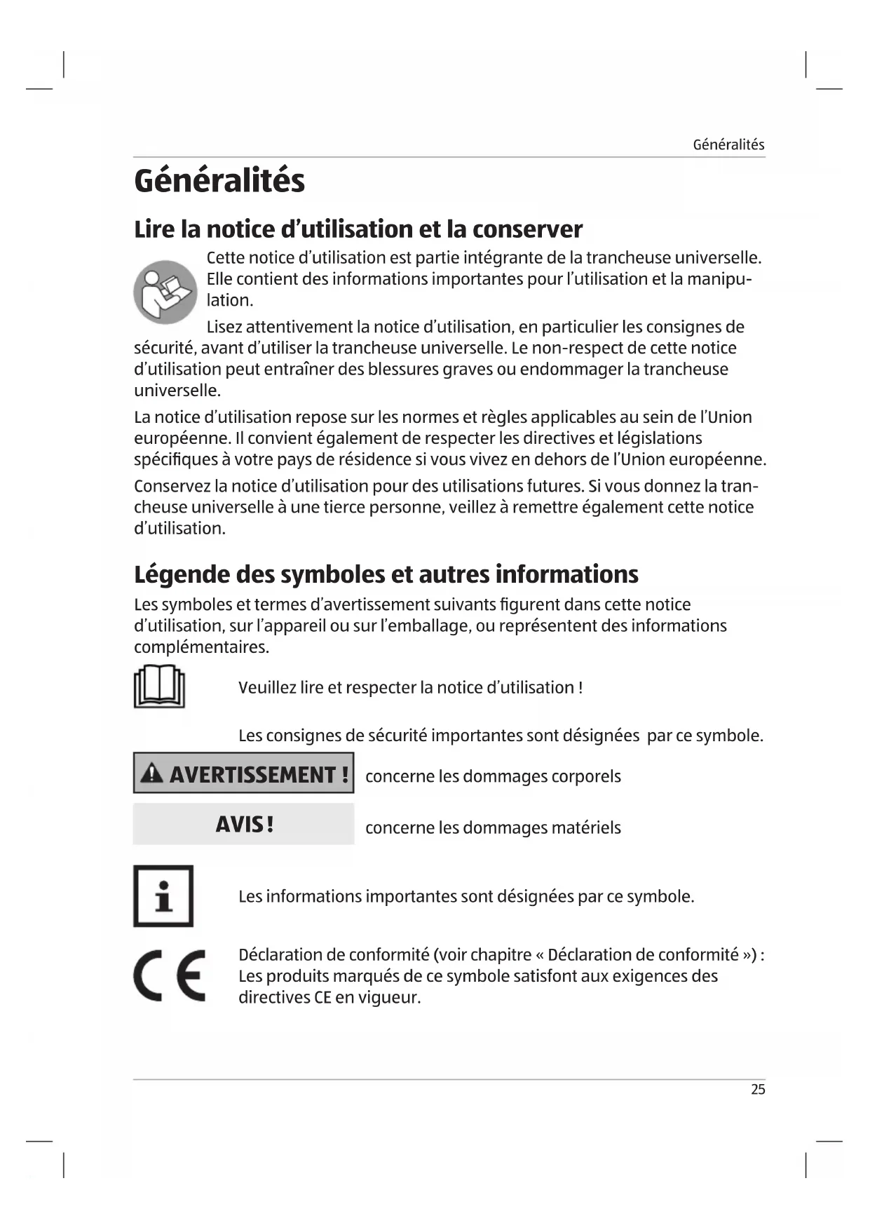 - Vue d’ensemble Généralités Généralités Lire la notice d’utilisation et la conserver Cette notice d’utilisation est partie intégrante de la trancheuse universelle. Elle contient des informations importantes pour l’utilisation et la manipu- lation. Lisez attentivement la notice d’utilisation, en particulier les consignes de sécurité, avant d’utiliser la trancheuse universelle. Le non-respect de cette notice d’utilisation peut entraîner des blessures graves ou endommager la trancheuse universelle. La notice d’utilisation repose sur les normes et règles applicables au sein de l’Union européenne. Il convient également de respecter les directives et législations spécifiques à votre pays de résidence si vous vivez en dehors de l’Union européenne. Conservez la notice d’utilisation pour des utilisations futures. Si vous donnez la tran- cheuse universelle à une tierce personne, veillez à remettre également cette notice d’utilisation. Légende des symboles et autresinformations Les symboles et termes d’avertissement suivants figurent dans cette notice d’utilisation, sur l’appareil ou sur l’emballage, ou représentent des informations complémentaires. Veuillez lire et respecter la notice d’utilisation! Les consignes de sécurité importantes sont désignées par ce symbole. AVERTISSEMENT! concerne les dommages corporels AVIS ! concerne les dommages matériels Les informations importantes sont désignées par cesymbole. Déclaration de conformité (voir chapitre «Déclaration de conformité»): Les produits marqués de ce symbole satisfont aux exigences des directives CE en vigueur.26 Généralités/Sécurité Ce symbole indique des appareils électriques qui correspondent à la classe de protection II. Le label «Geprüfte Sicherheit» (Sécurité contrôlée) certifie que cet appareil peut être utilisé en toute sécurité dans des conditions d’utilisation prévisibles. Le label atteste que cet appareil est conforme à la loi sur la sécurité des produits. Ce symbole fait référence aux prescriptions spéciales en matière d’élimination des appareils usagés (voir le chapitre«Élimination»). Sécurité Utilisation conforme à l’usageprévu Cet appareil est exclusivement conçu pour couper des tranches de pain, de viande, de jambon, de charcuterie, de fromage, etc. dans le cadre d’un usage domestique. De plus, l’appareil n’est pas destiné à une utilisation professionnelle mais uniquement à une utilisation privée. Il ne peut être uti- lisé par les employés de magasins, bureaux et autres établis- sements industriels, dans les propriétés agricoles, ou par les clients d’hôtels, motels et autres types d’hébergement comme les chambres d’hôtes. Toute autre utilisation ou modification de l’appareil n’est pas conforme et est strictement interdite. Nous ne pouvons être tenus responsables des dommages sur- venus à la suite d’une utilisation non conforme ou incorrecte.27 Consignes de sécurité AVERTISSEMENT ! Veuillez lire et respecter les consignes de sécurité énoncées ci-après. Le non-respect de ces consignes peut engendrer des risques d’accident et de blessures, ainsi que des dommages matériels ou des dysfonctionnements de l’appareil. Risques pour les enfants et lespersonnes dont les facultés sont limitées - Les personnes dont les facultés physiques, sensorielles ou mentales sont limitées ou les personnes manquant d’expérience et/ou de connaissances sont autorisés à utiliser cet appareil, à condition qu’ils soient surveillés ou qu’ils aient été instruits quant à son usage sûr et qu’ils aient compris les dangers en résultant. - Les enfants ne doivent pas procéder au nettoyage et à l’entretien de l’appareil. - Cet appareil ne peut pas être utilisé par les enfants. Conservez cet appareil et son câble électrique hors de la portée des enfants. - Les enfants ne doivent pas jouer avec l’appareil. Les enfants ne sont pas conscients du danger inhérent à l’utilisation d’appareils électriques. Par conséquent, utilisez et conservez l’appareil hors de la portée de ces derniers. Ne laissez pas pendre le cordon électrique afin d’éviter que quelqu’un ne tire dessus. - Conservez l’emballage hors de portée des enfants – Risque d’asphyxie! Sécurité28 Sécurité Risques liés à l’utilisation d’appareils électriques - Branchez l’appareil uniquement sur une prise secteur avec terre installée de manière conforme et dont la tension de secteur respecte la plaque signalétique. - Si le cordon d’alimentation de cet appareil est endommagé, il doit être remplacé par le fabricant, le service client de ce dernier ou toute personne suffisamment qualifiée, afin d’éviter toute mise en danger. - Seuls des ateliers spécialisés et habilités sont autorisés à effectuer les réparations. Les appareils réparés par un per- sonnel non spécialisé représentent un danger pour l’utilisa- teur. - Éteignez toujours l’appareil et débranchez-le lorsqu’il est laissé sans surveillance, lors du montage/démontage de ses accessoires, avant d’approcher vos mains des éléments mobiles ou de le nettoyer. Pour débrancher, tirez toujours au niveau de la fiche et non au niveau du cordon! Risque d’électrocution! - Afin d’éviter tout accident, n’utilisez jamais la même prise secteur avec terre pour brancher simultanément plusieurs appareils ménagers (par exemple sur une triplite). - Ne plongez jamais l’appareil dans l’eau et ne l’utilisez pas en plein air, car ce dernier ne doit en aucun cas être exposé à la pluie ou à l’humidité ! Risque d’électrocution ! - Si l’appareil venait à tomber dans l’eau, débranchez d’abord la prise avant de le sortir de l’eau! Ne remettez pas l’appareil en service avant de l’avoir fait contrôler par un SAV agréé. Cela s’applique également en cas de détérioration du cor- don élec