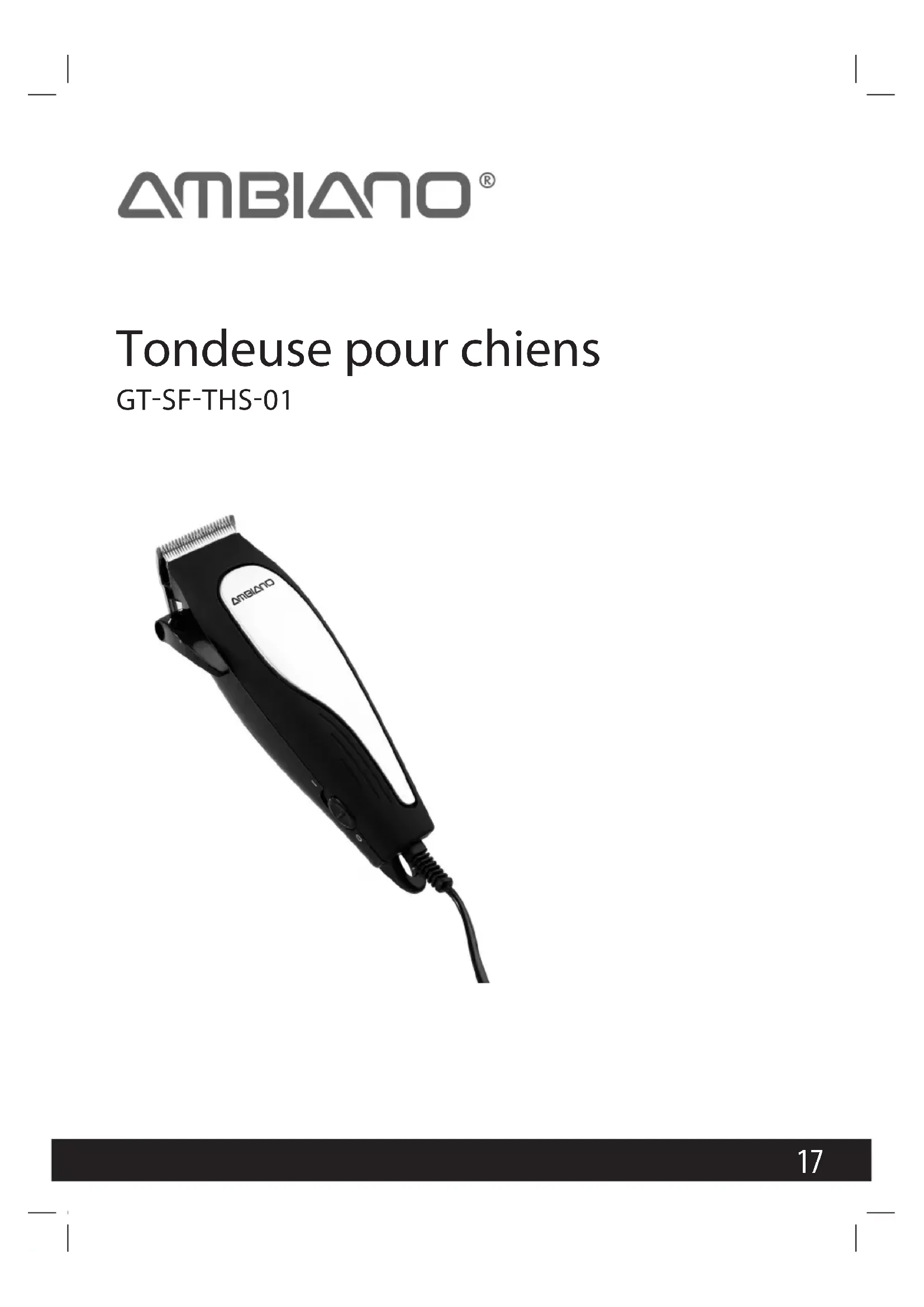 - Si vous n’êtes pas entièrement satis- fait des premiers résultats, veuillez29 tenir compte du fait que vous aurez besoin d’un peu d’entraînement pour obtenir le résultat voulu. Nous attirons votre attention sur le fait que nous devons décliner toute res- ponsabilité pour la coupe du pelage ou de la fourrure de votre animal.3030 Panne : L’appareil ne foncti- onne pas. La tondeuse ne coupe plus correctement. Cause : L’appareil n’est pas relié à la prise secteur. L’appareil n’est pas allumé. La tête de coupe est encombrée de poils. La tête de coupe est grippée. Solution : Branchez l’appareil à une prise secteur installée de manière conforme. Allumez l’appareil au moyen du bouton MARCHE/ARRÊT. Nettoyez la tête de coupe comme indiqué dans la secti- on « Nettoyage et entretien ». Huilez légèrement la tête de coupe (p.ex. avec de l’huile de lubrification) Pannes et solutions Si le problème rencontré n’est pas énuméré dans ce tableau, merci de contacter notre SAV. Nos conseillers client se feront un plaisir de vous aider. Vous trouverez les coor- données de notre service client dans nos conditions de garantie. Etant donné que nos produits sont constamment perfectionnés et améliorés, des modifications techniques et de design sont possibles. Cette notice d’utilisation peut également être téléchargée sous forme de fichier pdf depuis notre site Internet www.gt-support.de.31 Maintenance, nettoyage et entretien Débranchez toujours la prise avant le nettoyage et laissez l’appareil refroidir complète- ment avant de le nettoyer et de le ranger! Risque d’électrocution! Veillez à ce qu’aucun liquide ne pénètre à l’intérieur de l’appareil. Ne plongez jamais l’appareil dans l’eau. Risque d’électrocution! N’utilisez jamais de produits de nettoyage abrasifs ou récurants, ni d’objet pointu pour nettoyer l’appareil. Ne plongez en aucun cas la ton- deuse(C) dans l’eau et ne la mettez jamais sous un jet d’eau courante pour nettoyer les lames ou la tête de coupe(E). Le meilleur moyen de retirer les résidus de poils de la tête de coupe (E) est d’utiliser le petit pinceau de nettoyage fourni (O). Pour nettoyer le corps de l’appareil, utilisez un tissu légèrement humidifié et bien essoré. Puis séchez-le bien en essuyant. N’utilisez jamais de solvants ou de produits nettoyants pour le net- toyage. Appliquez régulièrement une à deux gouttes d’une huile adaptée sur les lames de la tête de coupe (E) (par ex. de l’huile de lubrification). Veillez à ce qu’aucun liquide ne pénètre à l’intérieur de l’appareil. Veillez à ne pas mettre trop d’huile. L’appareil pourrait être endommagé si de l’huile pénétrait dans le moteur.32 Recyclage Données techniques Tension nominale : 230 V~ Fréquence nominale : 50 Hz Puissance nominale : 8 W Classe de protection : II Élimination de l’emballage Éliminez l’emballage selon les sortes. Mettez le carton dans la collecte de vieux papier, les films dans la collecte de recyclage. Élimination de l’appareil Éliminez le produit conformé- ment aux dispositions appli- cables dans votre pays. Les appareils usagés ne doivent pas être jetés avec les déchets ménagers! Le symbole de la poubelle barrée signifie que les appareils élec- triques et électroniques ne doivent jamais être jetés dans la poubelle des ordures ménagères. Les consomma- teurs sont contraints par la loi de jeter les appareils électriques et électro- niques arrivés en fin de vie, sépa- rément des déchets ménagers non triés. Cela permettra de garantir une valorisation des déchets respectueuse de l’environnement et des ressources. Les batteries et accumulateurs qui ne sont pas fixés dans l’appareil électrique ou électronique et qui peuvent être extraits sans dommage, doivent être retirés de l’appareil avant de l’emmener dans un point de collecte et éliminés de manière appropriée. Cela s’applique égale- ment aux ampoules qui peuvent être extraites de l’appareil sans dommage. Les propriétaires privés d’appareils électriques et électroniques peuvent les déposer dans des déchetteries municipales ou les déposer dans les points de collecte mis en place par les fabricants ou les revendeurs. Le dépôt d’appareils usagés est gratuit. D’une manière générale, les reven- deurs sont tenus de proposer un service gratuit de reprise des appa- reils usagés, en mettant à disposition des points de collecte appropriés, à une distance raisonnable. Les consommateurs ont la possibilité de déposer gratuitement un appa- reil usagé auprès d’un revendeur soumis à l’obligation de reprendre ces appareils, lorsqu’ils achètent un appareil neuf équivalent, offrant globalement les mêmes fonctions. Cette possibilité est aussi offerte pour les livraisons à un ménage privé.33 Haarschneider für Hunde GT-SF-THS-0134 Inhaltsverzeichnis Inhaltsverzeichnis 34 Allgemeines 35 Einführung 35 EU-Konformitätserklärung 35 Bestimmungsgemäße Verwendung 35 Produktbestandteile/ Lieferumfang 36 Sicherheit 37 Allgemeine Sicherheitshinweise 37 Gefahren für Kinder und Personen mit eingeschränkten Fähigkeiten 37 Gefahren beim Umgang mit Elektrogeräten 38 Gefahren beim Betrieb des Haarschneiders für Hunde 39 Symbolerklärung und weitere Informationen 41 Aufbau und Montage 42 Vor dem ersten Gebrauch 42 Bedienung 43 Benutzung des Gerätes 43 Störung und Behebung 46 Wartung, Reinigung und Pflege 47 Technische Daten 48 Entsorgen 4835 ID 1111250395 Einführung Vielen Dank, dass Sie sich für einen Haarschneider für Hunde von Ambiano entschieden haben. Sie haben damit ein qualitativ hochwertiges Produkt erworben, das höchste Leistungs- und Sicherheitsstandards erfüllt. Für den richtigen Umgang und eine lange Lebensdauer empfehlen wir Ihnen die nachfolgenden Hinweise zu beachten. Bitte lesen Sie die Anleitung und insbesondere die Sicherheitshinwei