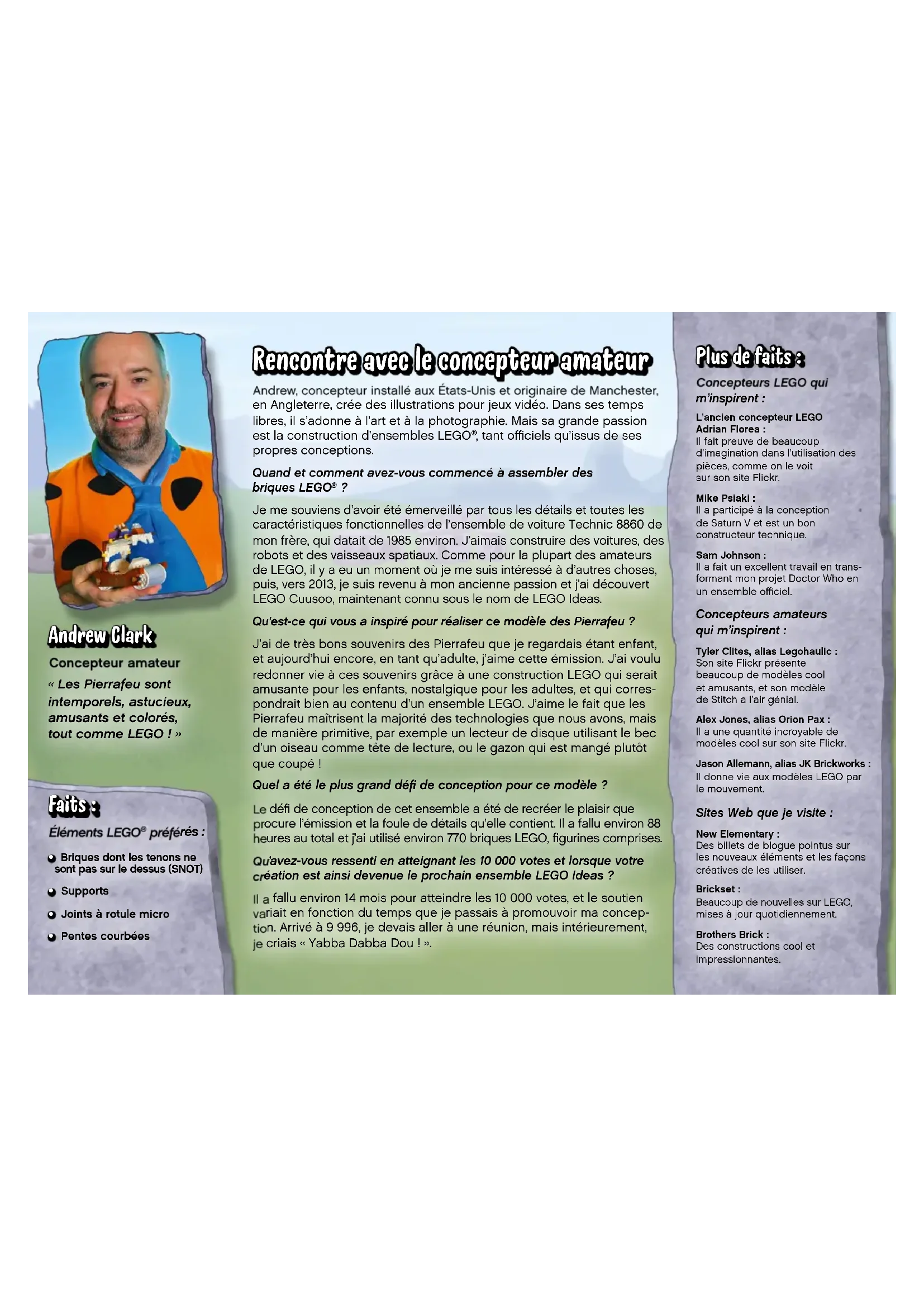 Je me souviens d’avoir été émerveillé par tous les détails et toutes les caractéristiques fonctionnelles de l’ensemble de voiture Technic 8860 de mon frère, qui datait de 1985 environ. J’aimais construire des voitures, des robots et des vaisseaux spatiaux. Comme pour la plupart des amateurs de LEGO, il y a eu un moment où je me suis intéressé à d’autres choses, puis, vers 2013, je suis revenu à mon ancienne passion et j’ai découvert LEGO Cuusoo, maintenant connu sous le nom de LEGO Ideas.Qu’est-ce qui vous a inspiré pour réaliser ce modèle des Pierrafeu ?J’ai de très bons souvenirs des Pierrafeu que je regardais étant enfant, et aujourd’hui encore, en tant qu’adulte, j’aime cette émission. J’ai voulu redonner vie à ces souvenirs grâce à une construction LEGO qui serait amusante pour les enfants, nostalgique pour les adultes, et qui corres-pondrait bien au contenu d’un ensemble LEGO. J’aime le fait que les Pierrafeu maîtrisent la majorité des technologies que nous avons, mais de manière primitive, par exemple un lecteur de disque utilisant le bec d’un oiseau comme tête de lecture, ou le gazon qui est mangé plutôt que coupé !Quel a été le plus grand défi de conception pour ce modèle ? Le défi de conception de cet ensemble a été de recréer le plaisir que procure l’émission et la foule de détails qu’elle contient. Il a fallu environ 88 heures au total et j’ai utilisé environ 770 briques LEGO, figurines comprises. Qu’avez-vous ressenti en atteignant les 10 000 votes et lorsque votre création est ainsi devenue le prochain ensemble LEGO Ideas ? Il a fallu environ 14 mois pour atteindre les 10 000 votes, et le soutien variait en fonction du temps que je passais à promouvoir ma concep- tion. Arrivé à 9 996, je devais aller à une réunion, mais intérieurement, je criais « Yabba Dabba Dou ! ». Concepteurs LEGO qui m’inspirent : L’ancien concepteur LEGO Adrian Florea : Il fait preuve de beaucoup d’imagination dans l’utilisation des pièces, comme on le voit sur son site Flickr.Mike Psiaki : Il a participé à la conception de Saturn V et est un bon constructeur technique.Sam Johnson : Il a fait un excellent travail en trans-formant mon projet Doctor Who en un ensemble officiel. Concepteurs amateurs qui m’inspirent : Tyler Clites, alias Legohaulic : Son site Flickr présente beaucoup de modèles cool et amusants, et son modèle de Stitch a l’air génial.Alex Jones, alias Orion Pax : Il a une quantité incroyable de modèles cool sur son site Flickr. Jason Allemann, alias JK Brickworks : Il donne vie aux modèles LEGO par le mouvement. Sites Web que je visite : New Elementary : Des billets de blogue pointus sur les nouveaux éléments et les façons créatives de les utiliser.Brickset : Beaucoup de nouvelles sur LEGO, mises à jour quotidiennement. Brothers Brick : Des constructions cool et impressionnantes. Concepteur amateur « Les Pierrafeu sont intemporels, astucieux, amusants et colorés, tout comme LEGO ! » Éléments LEGO préférés :