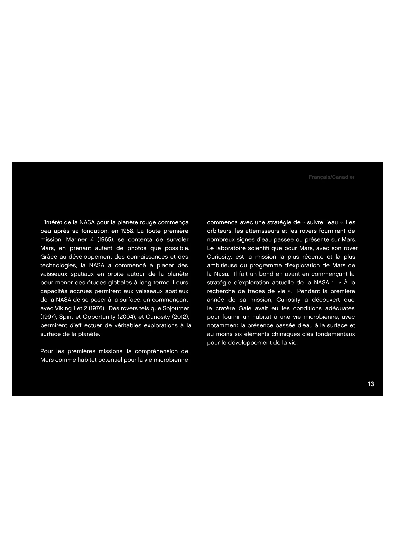 21104_BI_BK1.indd 12 17/09/2013 3:33 PML’intérêt de la NASA pour la planète rouge commença peu après sa fondation, en 1958. La toute première mission, Mariner 4 (1965), se contenta de survoler Mars, en prenant autant de photos que possible. Grâce au développement des connaissances et des technologies, la NASA a commencé à placer des vaisseaux spatiaux en orbite autour de la planète pour mener des études globales à long terme. Leurs capacités accrues permirent aux vaisseaux spatiaux de la NASA de se poser à la surface, en commençant avec Viking 1 et 2 (1976). Des rovers tels que Sojourner (1997), Spirit et Opportunity (2004), et Curiosity (2012), permirent d’eff ectuer de véritables explorations à la surface de la planète. Pour les premières missions, la compréhension de Mars comme habitat potentiel pour la vie microbienne commença avec une stratégie de « suivre l’eau ». Les orbiteurs, les atterrisseurs et les rovers fournirent de nombreux signes d’eau passée ou présente sur Mars. Le laboratoire scientifi que pour Mars, avec son rover Curiosity, est la mission la plus récente et la plus ambitieuse du programme d’exploration de Mars de la Nasa. Il fait un bond en avant en commençant la stratégie d’exploration actuelle de la NASA : « À la recherche de traces de vie ». Pendant la première année de sa mission, Curiosity a découvert que le cratère Gale avait eu les conditions adéquates pour fournir un habitat à une vie microbienne, avec notamment la présence passée d’eau à la surface et au moins six éléments chimiques clés fondamentaux pour le développement de la vie. Français/Canadien