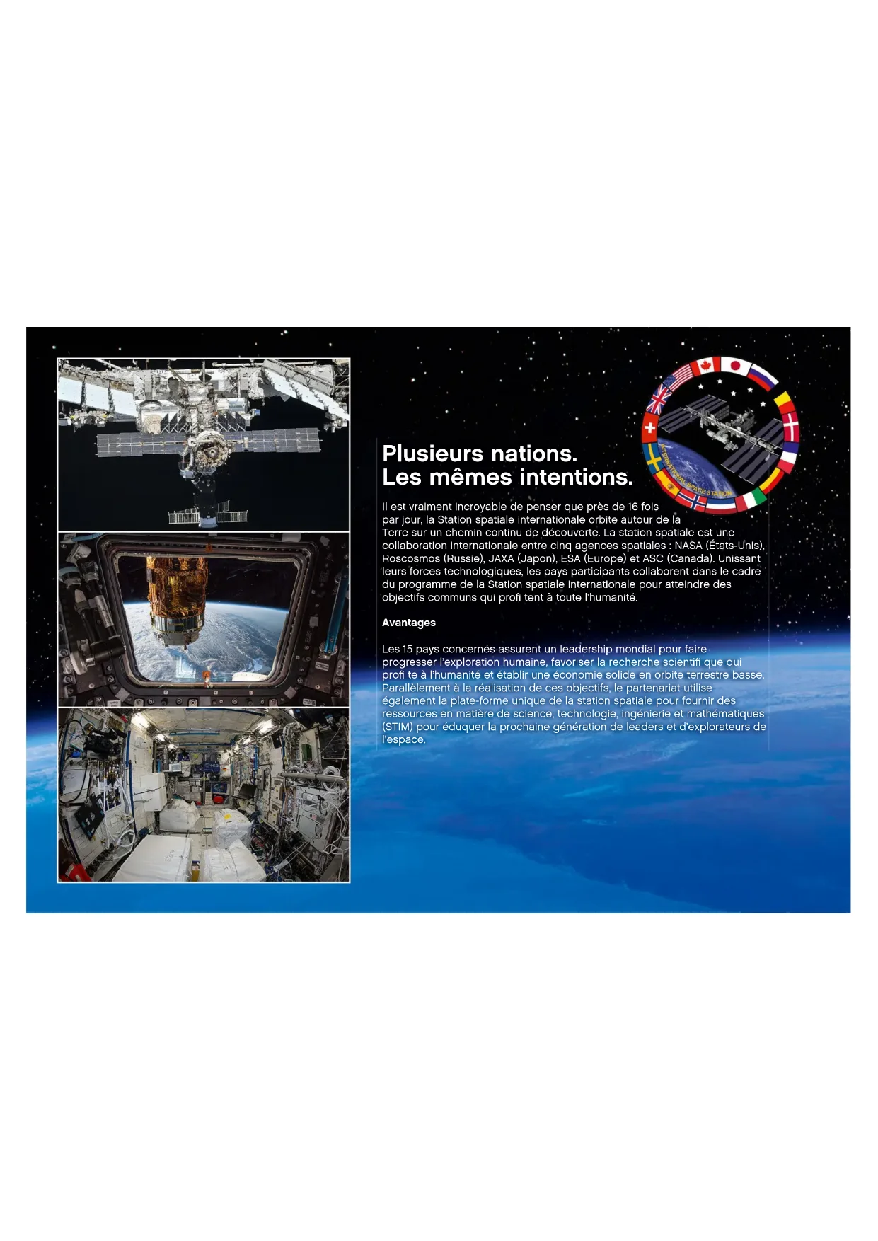 Ideas process upside down. This time we started the internal review and came up with four exciting projects that showed the greatest potential – and then it was up to the LEGO Ideas community to decide which of the four would be made into LEGO Ideas set #29. It was great fun to follow the fan vote and we were excited to be able to fi nally include the International Space Station into the LEGO Ideas family”. Monica Pedersen, Global Senior Marketing ManagerPlusieurs nations. Les mêmes intentions. Il est vraiment incroyable de penser que près de 16 fois par jour, la Station spatiale internationale orbite autour de la Terre sur un chemin continu de découverte. La station spatiale est une collaboration internationale entre cinq agences spatiales : NASA (États-Unis), Roscosmos (Russie), JAXA (Japon), ESA (Europe) et ASC (Canada). Unissant leurs forces technologiques, les pays participants collaborent dans le cadre du programme de la Station spatiale internationale pour atteindre des objectifs communs qui profi tent à toute l’humanité. Avantages Les 15 pays concernés assurent un leadership mondial pour faire progresser l’exploration humaine, favoriser la recherche scientifi que qui profi te à l’humanité et établir une économie solide en orbite terrestre basse. Parallèlement à la réalisation de ces objectifs, le partenariat utilise également la plate-forme unique de la station spatiale pour fournir des ressources en matière de science, technologie, ingénierie et mathématiques (STIM) pour éduquer la prochaine génération de leaders et d’explorateurs de l’espace.La recherche dans l’espace Ce qui se passe à bord de cette station spatiale est également étonnant. La station maintient une présence humaine continue dans l’espace depuis novembre 2000. Les astronautes à bord ont eff ectué des milliers d’études consacrées aux domaines des sciences de la Terre et de l’espace, de la biologie, de la physiologie humaine, des sciences physiques et des démonstrations technologiques. Comme l’affi rme la NASA : « La Station spatiale internationale est un laboratoire de microgravité de pointe qui permet des découvertes impossibles sur Terre et qui nous aide à aller plus loin dans l’espace lointain. » La recherche eff ectuée dans cet immense laboratoire en orbite, le plus grand vaisseau spatial jamais construit, étudie comment nous pouvons envoyer des humains plus loin dans l’espace, vers la Lune et Mars, pour explorer les frontières de la connaissance.Rencontre avec le concepteur amateur Christoph Ruge « En 2014, j’ai eu l’idée de modéliser la Station spatiale internationale à l’aide du logiciel LEGO