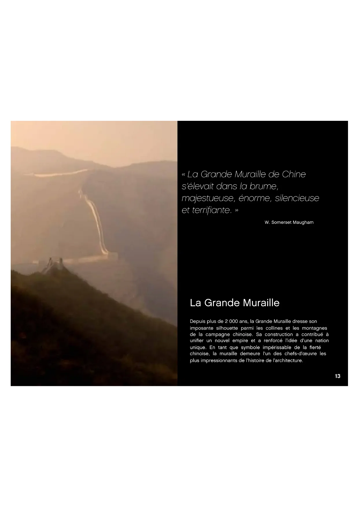 siècle av. J.-C., l’empereur Qin Shi Huang conquiert six royaumes avoisinant le sien, fondant ainsi la dynastie Qin et devenant le premier empereur chinois. En plus de relier les nombreux remparts érigés par les petits royaumes, il ordonne la construction d’un nouveau mur à la frontière nord afin de protéger son empire des tribus nomades. Les dynasties suivantes agrandissent le mur, mais ce n’est que sous la dynastie Ming que la majeure partie de la muraille que nous connaissons aujourd’hui est construite. Au cours d’une période de plus de 100 ans, les fortifications sont prolongées sur plus de 8 850 km. Contrairement aux premiers murs, souvent faits de terre compressée ou de bois, les nouvelles sections sont construites en pierres taillées ou en briques. Des forts, tours fortifiées et remparts sont ajoutés pour créer une imposante ligne de défense. La fin de la dynastie Ming en 1644 signale la fin des travaux de construction et d’entretien de la Grande Muraille. Il en sera ainsi jusqu’à ce que certaines sections des fortifications soient restaurées et ouvertes au public par le gouvernement de la République populaire de Chine dans les années 1950.15 « Un voyage de mille lieues commence toujours par un premier pas. » Proverbe chinoisL’édificationdelaGrandeMurailletellequ’onlaconnaîtaujourd’hui s’estétenduesurplusdeanssouslerègnededifférentesdynasties PériodedesPrintemps etAutomnes Septroyaumesenguerreconstruisent lespremièresfortificationspourprotéger leursfrontières DynastieQin QinShiHuangdevientlepremier empereurchinoisetconstruitunmur danslenorddesonroyaumeafinde leprotégerdesinvasionsmongoles DynastieHan Lemurs’agranditversl’ouestpour protégerlenombrecroissant demarchandisestransitantpar laroutedelasoie DynastieTang Ils’agitdel’unedes dynastieslesplusprospères etpacifiquesdel’histoire chinoisequicontribuapeuà l’édificationdelamuraille àavJ-C àavJ-C