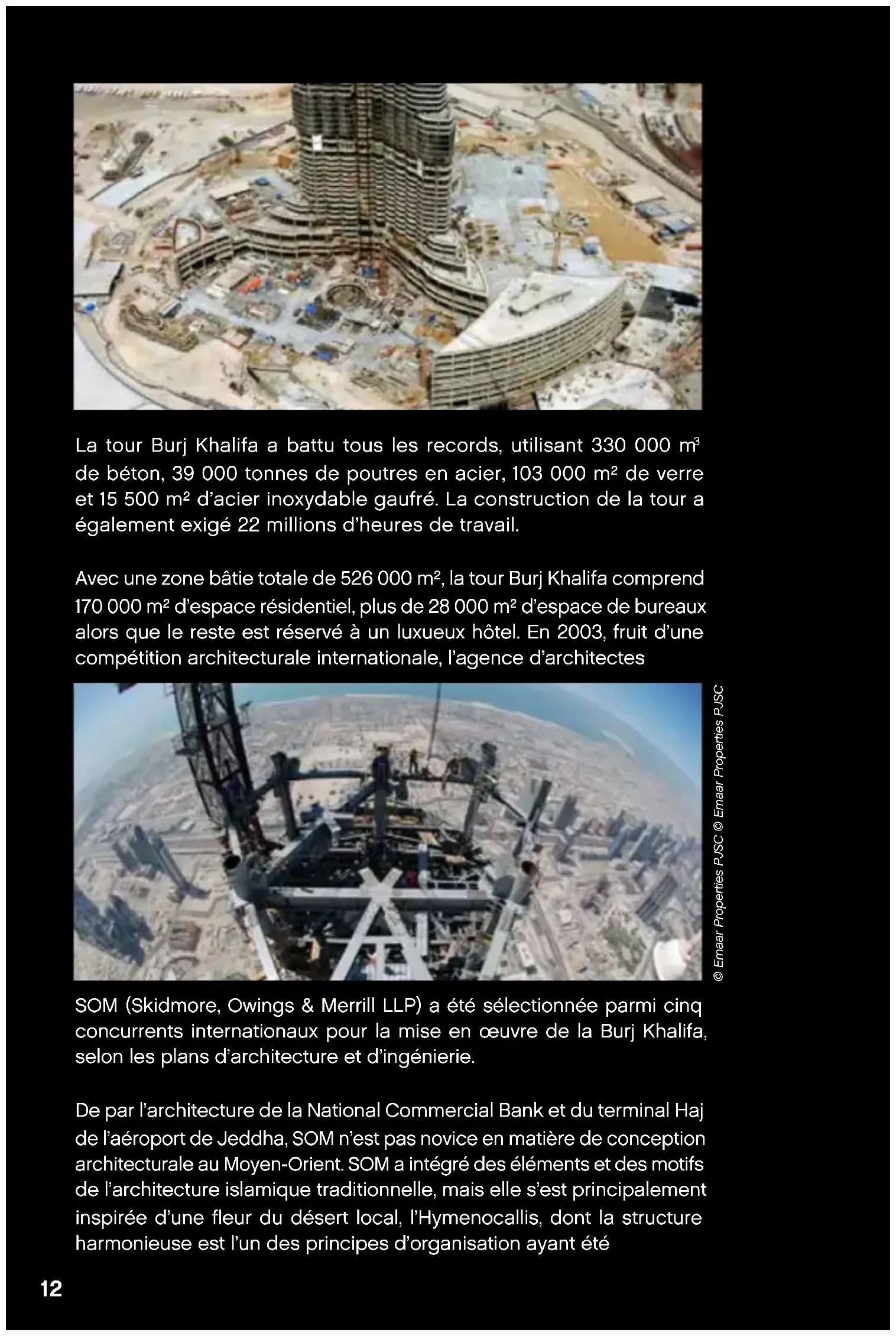 © Emaar Properties PJSC© Emaar Properties PJSC © Emaar Properties PJSC© Emaar Properties PJSC14 Pour l’architecture et l’ingénierie de la Burj Khalifa, l’agence d’architectes SOM (Skidmore, Owings & Merrill LLP) a collaboré avec les développeurs d’Emaar Properties PJSC, basés à Dubaï, pour redéfinir les possibilités à l’égard des gratte-ciel géants. Dotée d’un portfolio comprenant quelques-unes des plus importantes réalisations architecturales des 20