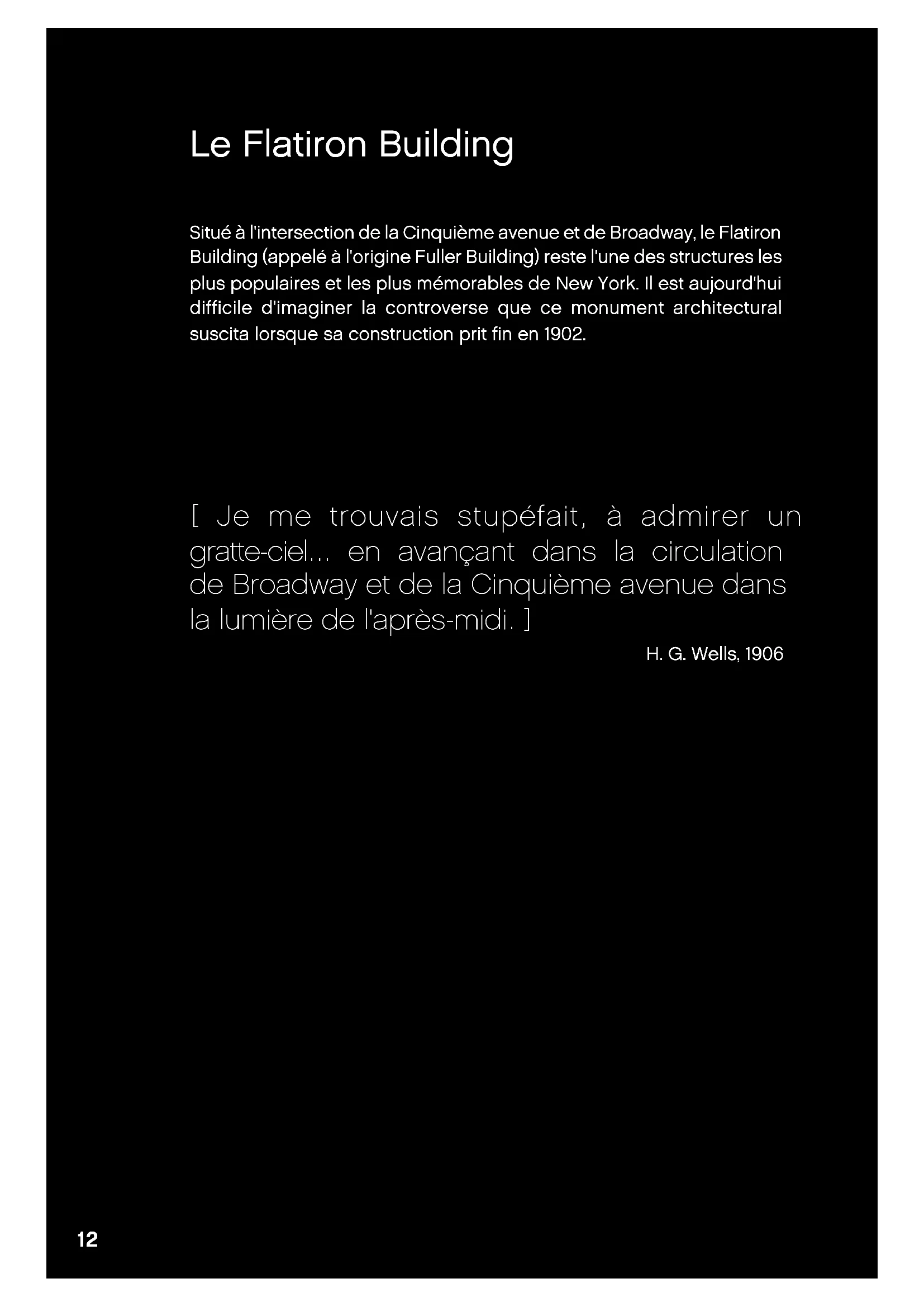 rue seulement un peu moins de 26,5 m de large. À la «pointe» du triangle, le bâtiment ne mesurerait que 2 m de large et formerait un angle aigu de 25 degrés. Burnham voyait le bâtiment comme un palazzo vertical de la Renaissance avec un style Beaux- Arts ou néoclassique. Le bâtiment serait séparé visuellement en trois sections distinctes. Il serait composé d'une façade en pierre calcaire richement décorée pour les trois étages du bas, et d'une section intermédiaire large et répétitive en terre cuite monochrome beige clair. La structure serait ensuite couronnée d'une corniche sur toute la longueur du bâtiment. © GettyImages15 Grâce à la charpente en acier, la construction du bâtiment fut effectuée rapidement et sans incident majeur. Alors que d'autres gratte-ciels de New York à l'époque étaient souvent de fines tours s'élevant à partir de blocs ressemblant à des piédestaux, le Flatiron était une structure massive unique. Ce design radical, combiné avec sa grande hauteur et sa forme inhabituelle, suscita beaucoup de débats lorsque la construction du bâtiment prit fin en 1902. De nombreux New-yorkais pensaient que la structure allait être instable et tomberait au premier coup de vent. Le bâtiment avait même été surnommé la «folie de Burnham», et des paris furent placés sur la distance qu'atteindraient les débris lorsqu'il s'écroulerait. Des vents forts allaient et venaient, et le bâtiment Flatiron leur résistait, comme il continue de le faire aujourd'hui, plus d'un siècle plus tard. Ceci est une preuve que la structure était non seulement une idée architecturale forte, mais aussi une merveille d'ingénierie. © GettyImages16 L’architecte Né à New York et élevé à Chicago, Daniel H. Burnham allait devenir l'un des pères fondateurs de l'École d'architecture de Chicago. Avec son partenaire de l'époque, John W. Root, Burnham construisit en 1892 l'un des premiers gratte-ciels américains, le bâtiment de 21 étages du temple maçonnique de Chicago, et créa en 1893 le plan architectural de la plus grande foire mondiale jamais organisée à l'époque. L'architecture de Burnham mélangeait des éléments du Modernisme avec un style plus néoclassique. Beaucoup de ses bâtiments, y compris le Flatiron, suivaient les conventions de la colonne classique : trois parties distinctes, avec une base, une section intermédiaire et une corniche ornementée en haut. Les premières esquisses de Burnham pour le Flatiron incluaient une horloge en façade et une couronne beaucoup plus élaborée en haut du bâtiment, mais il fut convaincu de supprimer ces deux éléments par son ancien partenaire John W. Root. Burnham conserva le contrôle général du projet, mais il engagea l'architecte F. P. Dinkelberg (1859–1935) pour effectuer la majorité du travail de supervision pendant la construction. Après le Flatiron Building, Burnham continua à travailler sur une série de projets architecturaux impressionnants, notamment plusieurs grands travaux de planification pour les villes de San Francisco, Washington, D.C., et Manille aux Philippines. Au moment de sa mort en 1912, son cabinet d'architecture, D. H. Burnham & Co., était le plus grand du monde. Daniel Hudson Burnham (1846 – 1912) © Wikipedia17 Plan pour le développement de Manille, soumis à la Commission philippine par D. H. Burnham, 1905 Plan pour San Francisco par Daniel Burnham et William Bennett, publié en 1906 © Wikipedia© Wikipedia18