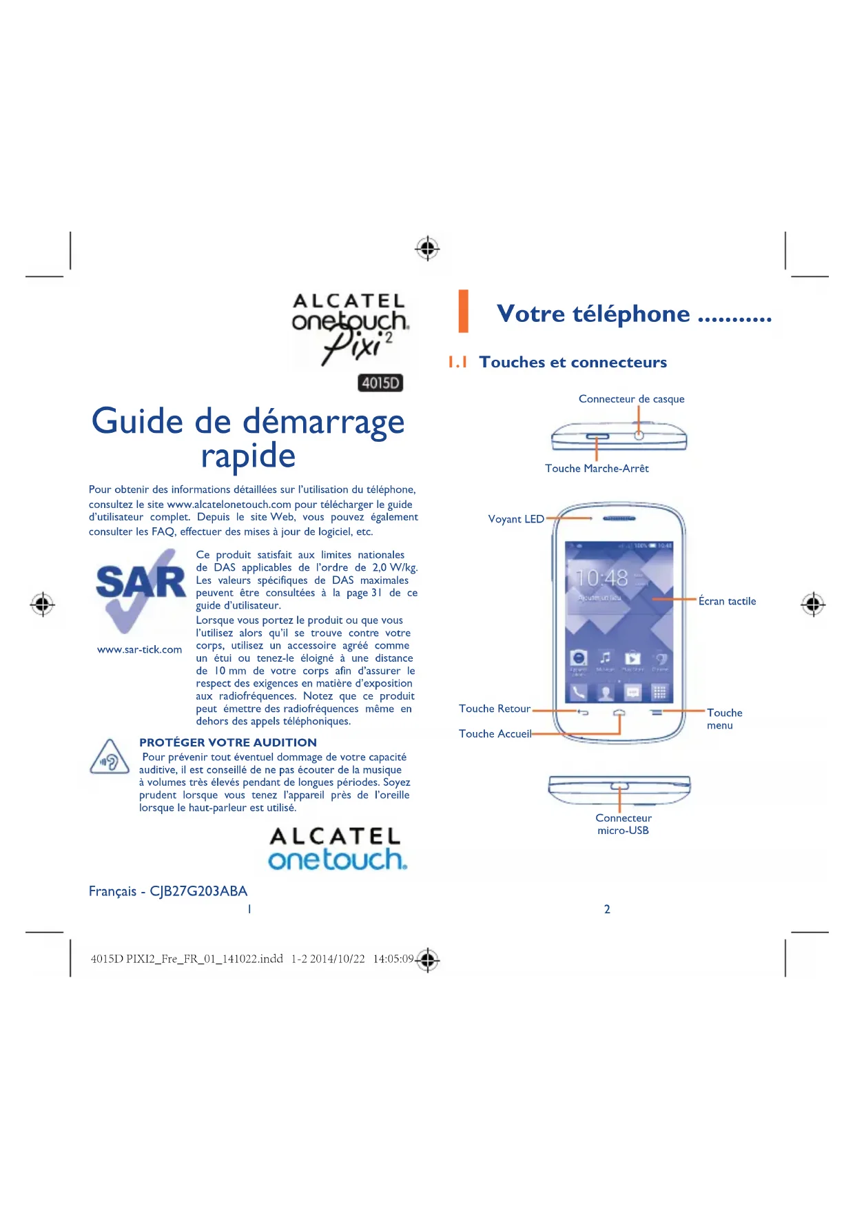 Touche Marche-ArrêtConnecteur de casque Connecteur micro-USBTouche RetourTouche AccueilTouche menu Écran tactileVoyant LED Guide de démarrage rapide Pour obtenir des informations détaillées sur l’utilisation du téléphone, consultez le site www.alcatelonetouch.com pour télécharger le guide d’utilisateur complet. Depuis le site Web, vous pouvez également consulter les FAQ, effectuer des mises à jour de logiciel, etc.www.sar-tick.comCe produit satisfait aux limites nationales de DAS applicables de l’ordre de 2,0 W/kg. Les valeurs spécifiques de DAS maximales peuvent être consultées à la page 31 de ce guide d’utilisateur.Lorsque vous portez le produit ou que vous l’utilisez alors qu’il se trouve contre votre corps, utilisez un accessoire agréé comme un étui ou tenez-le éloigné à une distance de 10 mm de votre corps afin d’assurer le respect des exigences en matière d’exposition aux radiofréquences. Notez que ce produit peut émettre des radiofréquences même en dehors des appels téléphoniques.PROTÉGER VOTRE AUDITION Pour prévenir tout éventuel dommage de votre capacité auditive, il est conseillé de ne pas écouter de la musique à volumes très élevés pendant de longues périodes. Soyez prudent lorsque vous tenez l’appareil près de l’oreille lorsque le haut-parleur est utilisé. Français - CJB27G203ABA 4015D PIXI2_Fre_FR_01_141022.indd 1-2 2014/10/22 14:05:093 4 Augmenter le volume Réduire le volume Appareil photo Touche Menu