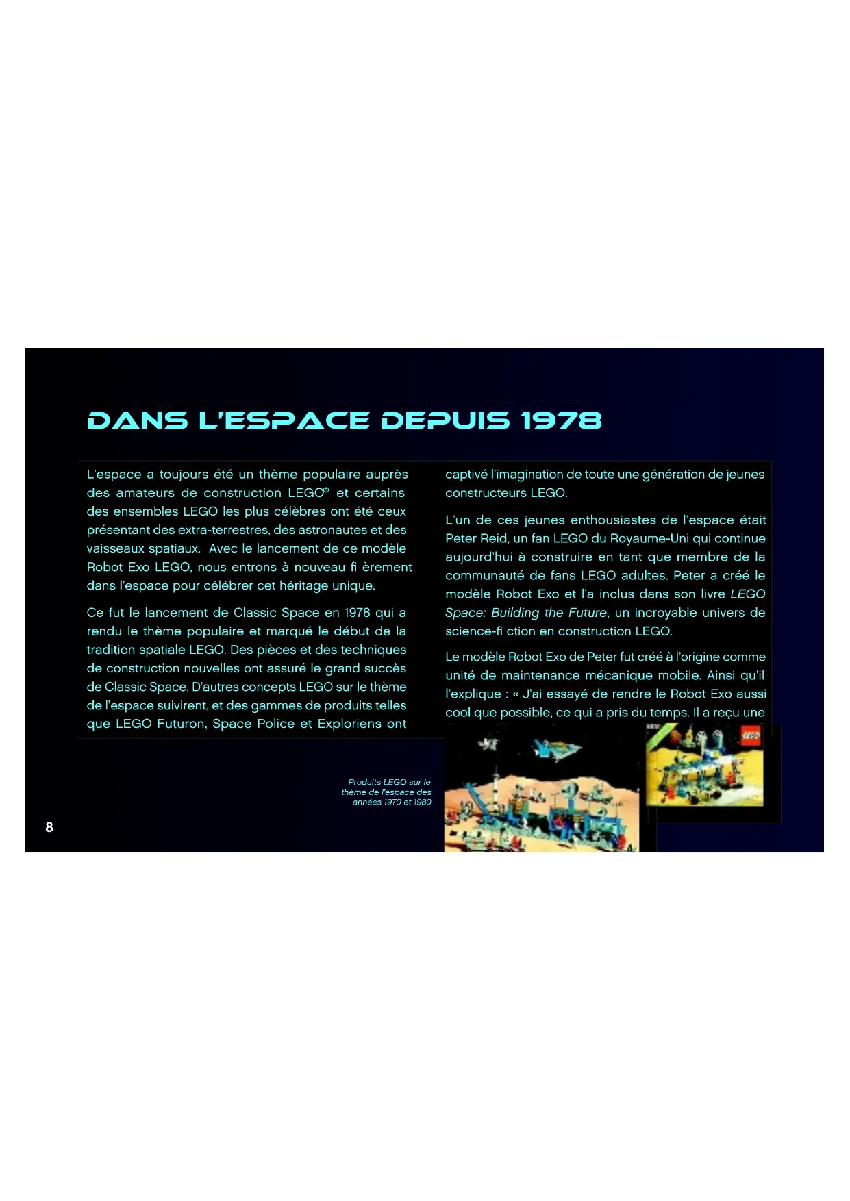 et certains des ensembles LEGO les plus célèbres ont été ceux présentant des extra-terrestres, des astronautes et des vaisseaux spatiaux. Avec le lancement de ce modèle Robot Exo LEGO, nous entrons à nouveau fi èrement dans l’espace pour célébrer cet héritage unique. Ce fut le lancement de Classic Space en 1978 qui a rendu le thème populaire et marqué le début de la tradition spatiale LEGO. Des pièces et des techniques de construction nouvelles ont assuré le grand succès de Classic Space. D’autres concepts LEGO sur le thème de l’espace suivirent, et des gammes de produits telles que LEGO Futuron, Space Police et Exploriens ont captivé l’imagination de toute une génération de jeunes constructeurs LEGO. L’un de ces jeunes enthousiastes de l’espace était Peter Reid, un fan LEGO du Royaume-Uni qui continue aujourd’hui à construire en tant que membre de la communauté de fans LEGO adultes. Peter a créé le modèle Robot Exo et l’a inclus dans son livre LEGO Space: Building the Future, un incroyable univers de science-fi ction en construction LEGO. Le modèle Robot Exo de Peter fut créé à l’origine comme unité de maintenance mécanique mobile. Ainsi qu’il l’explique : « J’ai essayé de rendre le Robot Exo aussi cool que possible, ce qui a pris du temps. Il a reçu une