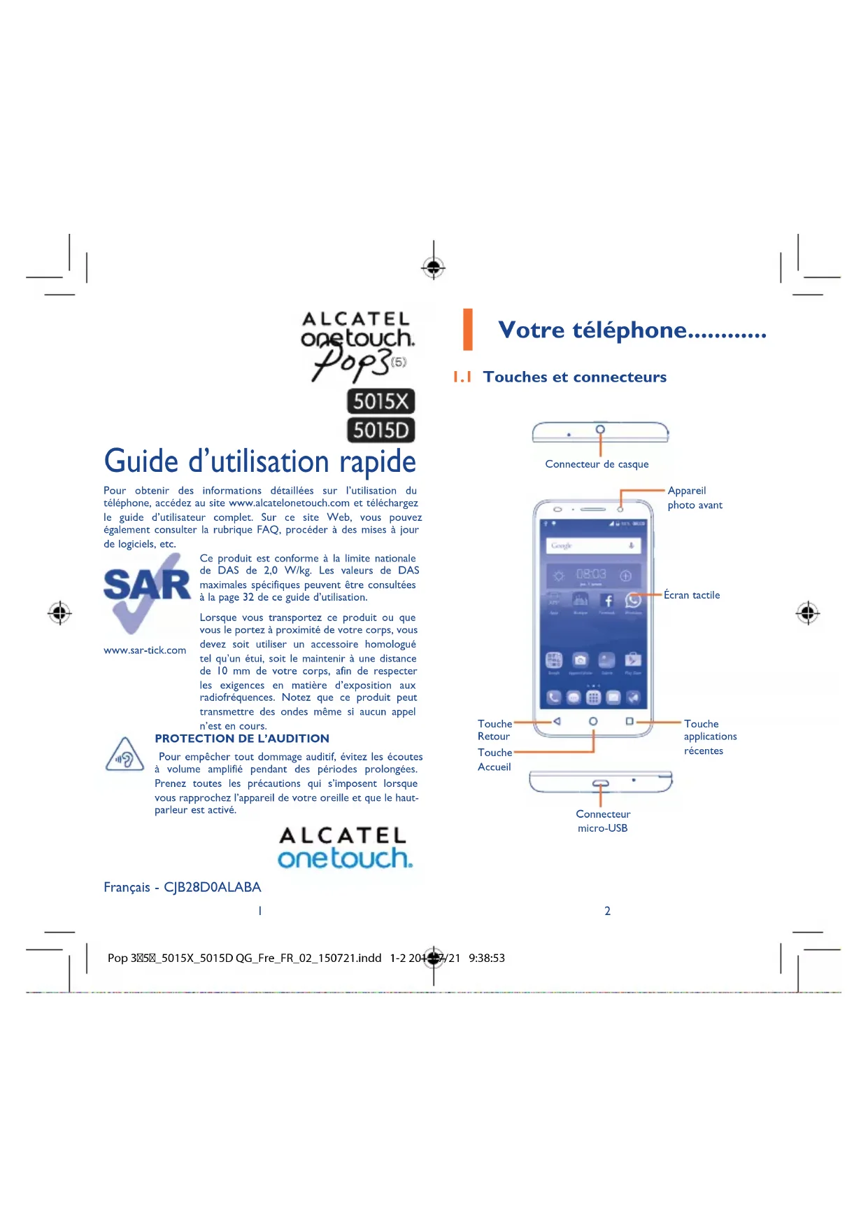 Votre téléphone 11 Touches et connecteurs Connecteur de casqueConnecteur micro-USBTouche RetourTouche AccueilTouche applications récentesÉcran tactileAppareil photo avantwww.sar-tick.comCe produit est conforme à la limite nationale de DAS de 2,0 W/kg. Les valeurs de DAS maximales spécifiques peuvent être consultées à la page 32 de ce guide d’utilisation.Lorsque vous transportez ce produit ou que vous le portez à proximité de votre corps, vous devez soit utiliser un accessoire homologué tel qu’un étui, soit le maintenir à une distance de 10 mm de votre corps, afin de respecter les exigences en matière d’exposition aux radiofréquences. Notez que ce produit peut transmettre des ondes même si aucun appel n’est en cours. Français - CJB28D0ALABA