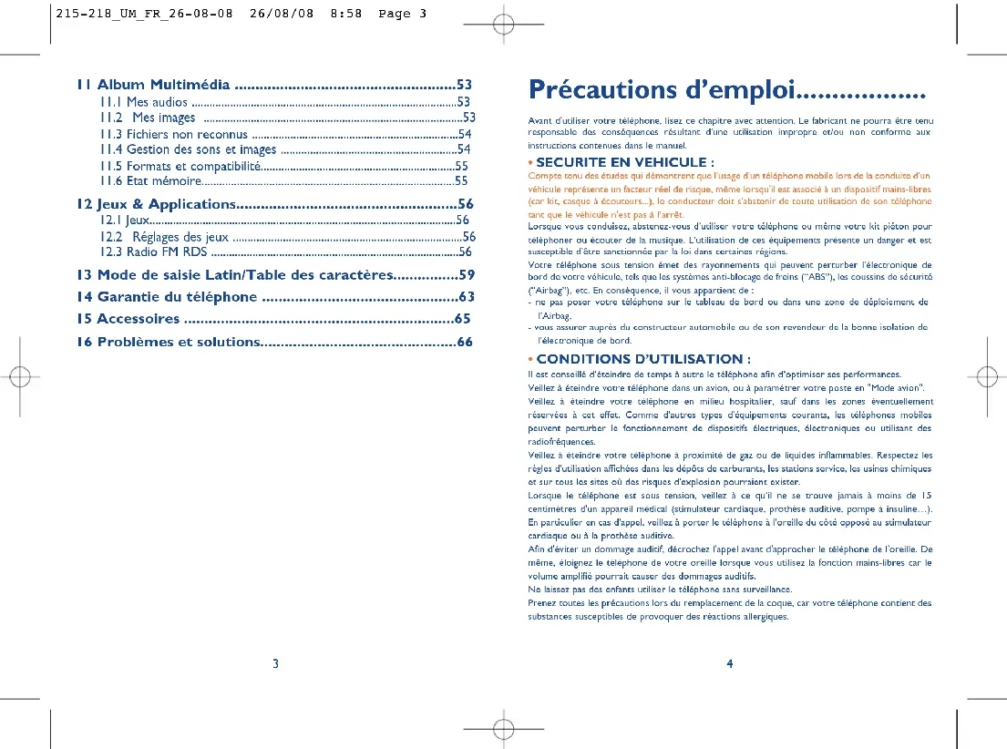 215-218_UM_FR_26-08-08 26/08/08 8:58 Page 1Précautions d’emploi.................. Avant d'utiliser votre téléphone, lisez ce chapitre avec attention. Le fabricant ne pourra être tenu responsable des conséquences résultant d'une utilisation impropre et/ou non conforme aux instructions contenues dans le manuel.
