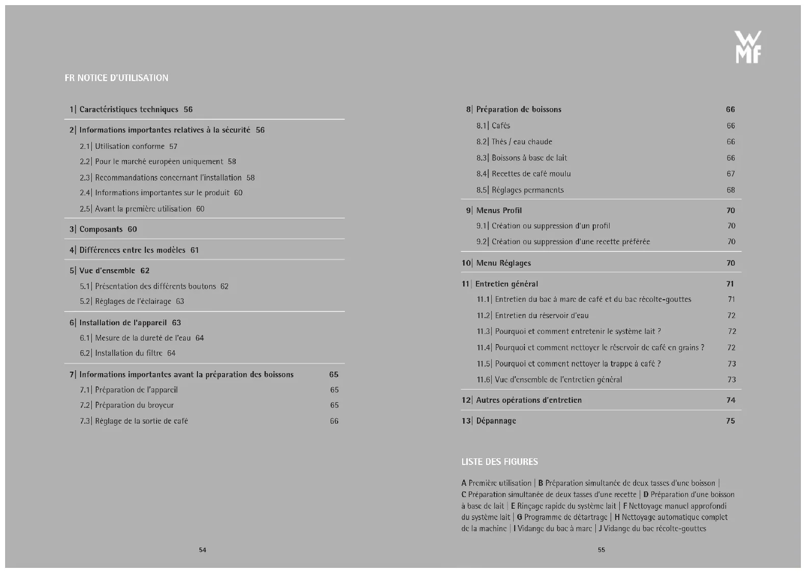 Félicitations! Vous êtes maintenant l’heureux propriétaire d’une WMF Perfection, une machine à café entièrement automatique. Les boissons les plus fréquemment consommées sont accessibles d’une simple pression sur l’interface principale. L’écran vous permet de suivre la préparation de votre café et offre un accès facile aux différents menus. La plupart des boissons peuvent être pré parées pour deux, une caractéristique conviviale qui permet de gagner du temps.Nous espérons que votre machine à café entiè-rement automatique WMF Perfection vous satisfera pleinement durant de nombreuses années. 1| CARACTÉRISTIQUES TECHNIQUES Appareil: machine à café entièrement automa-tique WMF PerfectionAlimentation électrique: 220 - 240V~/ 50HzPression de la pompe: 15barsRéservoir de café en grains: 250gCapacité du bac à marc: 15portionsRéservoir d’eau: 2,0lConsommation électrique: 1550 W en fonctionnementUtilisation et stockage: en intérieur, dans un endroit sec (et protégé du gel)Longueur de câble (m): approx. 1,1Dimensions (mm) H×l×P: 395×285×480Poids (kg): 12,0La période de garantie de cet appareil est de 2 ans. Veuillez vous reporter au document de garantie pour plus d’informations sur les autres clauses et conditions de garantie dans votre pays.Fabricant:SAS GSMRue Saint-Léonard F-53104 MayenneFrance 2| INFORMATIONS IMPORTANTES