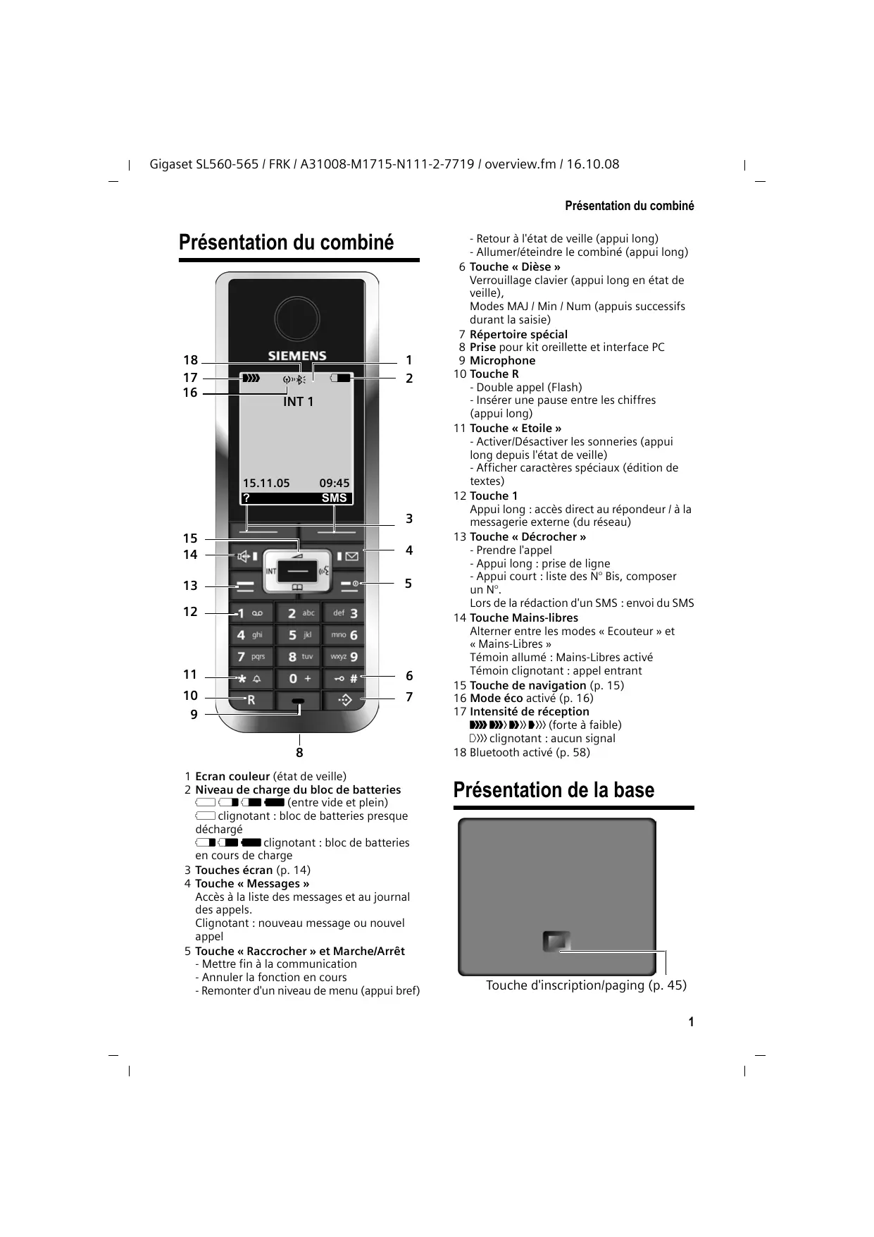 1 Ecran couleur (état de veille) 2 Niveau de charge du bloc de batteries = e V U (entre vide et plein) = clignotant : bloc de batteries presque déchargé e V U clignotant : bloc de batteries en cours de charge 3 Touches écran (p. 14) 4 Touche « Messages » Accès à la liste des messages et au journal des appels. Clignotant : nouveau message ou nouvel appel 5 Touche « Raccrocher » et Marche/Arrêt - Mettre fin à la communication - Annuler la fonction en cours - Remonter d'un niveau de menu (appui bref) - Retour à l'état de veille (appui long) - Allumer/éteindre le combiné (appui long) 6 Touche « Dièse » Verrouillage clavier (appui long en état de veille), Modes MAJ / Min / Num (appuis successifs durant la saisie) 7 Répertoire spécial 8 Prise pour kit oreillette et interface PC 9 Microphone 10 Touche R - Double appel (Flash) - Insérer une pause entre les chiffres (appui long) 11 Touche « Etoile » - Activer/Désactiver les sonneries (appui long depuis l'état de veille) - Afficher caractères spéciaux (édition de textes) 12 Touche 1 Appui long : accès direct au répondeur / à la messagerie externe (du réseau) 13 Touche « Décrocher » - Prendre l'appel - Appui long : prise de ligne - Appui court : liste des N° Bis, composer un N°. Lors de la rédaction d'un SMS : envoi du SMS 14 Touche Mains-libres Alterner entre les modes « Ecouteur » et « Mains-Libres » Témoin allumé : Mains-Libres activé Témoin clignotant : appel entrant 15 Touche de navigation (p. 15) 16 Mode éco activé (p. 16) 17 Intensité de réception Ð i Ñ Ò (forte à faible) | clignotant : aucun signal 18 Bluetooth activé (p. 58) Présentation de la base Touche d'inscription/paging (p. 45)