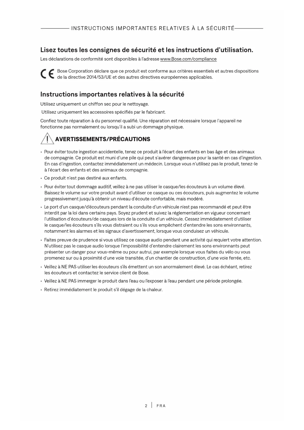 FRA Lisez toutes les consignes de sécurité et les instructions d’utilisation. Les déclarations de conformité sont disponibles à l’adresse www.Bose.com/compliancewww.Bose.com/compliance Bose Corporation déclare que ce produit est conforme aux critères essentiels et autres dispositions de la directive 2014/53/UE et des autres directives européennes applicables. Instructions importantes relatives à la sécurité Utilisez uniquement un chiffon sec pour le nettoyage. Utilisez uniquement les accessoires spécifiés par le fabricant. Confiez toute réparation à du personnel qualifié. Une réparation est nécessaire lorsque l’appareil ne fonctionne pas normalement ou lorsqu’il a subi un dommage physique.