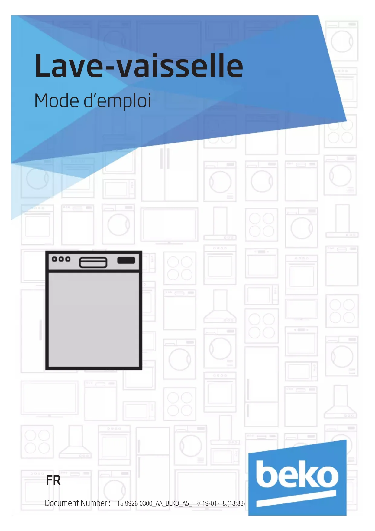 Avertissement en cas de décharge électrique L’emballage du produit est fait à partir de matériaux recyclables, conformément à notre Règlementation nationale en matière d'environnement. Ne jetez pas les éléments d’emballage avec les déchets domestiques et autres déchets. Déposez-les dans un des points de collecte d’éléments d’emballage que vous indiquera l’autorité locale dont vous dépendez. Ce produit a été fabriqué conformément aux conditions écologiques les plus récentes.FR Document Number : 15 9926 0300_AA_BEKO_A5_FR/ 19-01-18.(13:38) Lave-vaisselle Mode d’emploiAvant de commencer, bien vouloir lire ce manuel d'utilisation ! Cher client, Nous espérons que vous obtiendrez les meilleurs résultats de notre produit fabriqué à partir des technologies de pointe et des matériaux de qualité supérieure. C’est pourquoi nous vous recommandons, avant d’utiliser ce produit, de lire attentivement ce manuel et tous les autres documents fournis et de les conserver soigneusement pour toute consultation future. Si vous confiez le produit à quelqu’un d’autre, n’oubliez pas de lui remettre également le manuel d’utilisation. Veillez à bien respecter les consignes et les instructions figurant dans le manuel d’utilisation. Rappelez-vous que ce manuel de l'utilisateur correspond aussi à plusieurs autres modèles. Ce manuel marque les différences entres les modèles. Explication des symboles Tout au long de ce Manuel de l'utilisateur, les symboles suivants seront utilisés: