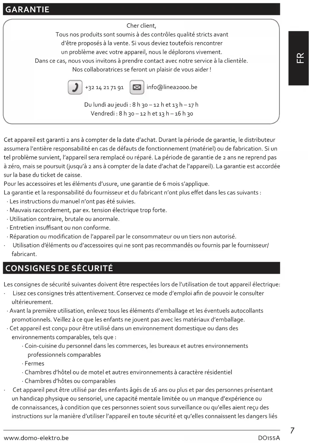 GARANTIE Cher client, Tous nos produits sont soumis à des contrôles qualité stricts avant d’être proposés à la vente. Si vous deviez toutefois rencontrer un problème avec votre appareil, nous le déplorons vivement. Dans ce cas, nous vous invitons à prendre contact avec notre service à la clientèle. Nos collaboratrices se feront un plaisir de vous aider ! +32 14 21 71 91 info@linea2000.be Du lundi au jeudi : 8 h 30 – 12 h et 13 h – 17 h Vendredi : 8 h 30 – 12 h et 13 h – 16 h 30 Cet appareil est garanti 2 ans à compter de la date d’achat. Durant la période de garantie, le distributeur assumera l’entière responsabilité en cas de défauts de fonctionnement (matériel) ou de fabrication. Si un tel problème survient, l’appareil sera remplacé ou réparé. La période de garantie de 2 ans ne reprend pas à zéro, mais se poursuit (jusqu’à 2 ans à compter de la date d’achat de l’appareil). La garantie est accordée sur la base du ticket de caisse. Pour les accessoires et les éléments d’usure, une garantie de 6 mois s’applique. La garantie et la responsabilité du fournisseur et du fabricant n’ont plus eet dans les cas suivants :