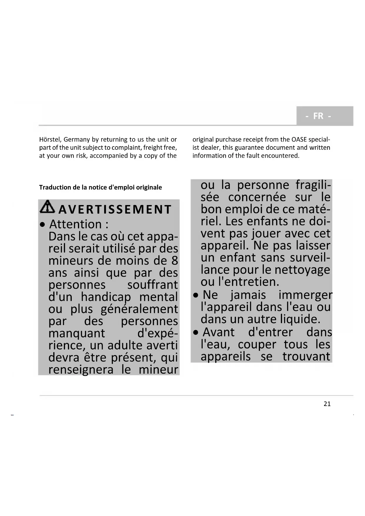 clauses de garantie suivantes. Le délai de garan- tie entre en vigueur dès la première acquisition chez le distributeur OASE. De ce fait, il ne se re- calcule pas à partir de toute date de vente ulté- rieure éventuelle. Les prestations de garantie ne donnent lieu ni à une prolongation ni au renou- vellement de la durée de garantie. Vos droits lé- gaux en tant qu'acquéreur, en particulier au ni- veau de la responsabilité, conservent leur vali- dité et ne sont pas restreints par cette garantie. Conditions de garantie La société OASE GmbH garantit une qualité et un façonnage irréprochables, conformes à la fina- lité, un montage conforme à la technique et une aptitude au fonctionnement réglementaire. La prestation de garantie inclut, en fonction de notre décision, la réparation à titre gracieux voire la livraison gratuite de pièces de rechange ou d'un appareil de remplacement. Si le type d'appareil concerné n'était plus fabriqué, nous nous réservons le droit de livrer un appareil de remplacement issu de notre gamme de produits, le plus proche possible du type d'appareil sujet à réclamation. Les réclamations dont la cause est liée à des erreurs de montage et d'exploitation, ainsi qu'à un entretien insuffisant, p. ex. à l'utili- sation de produits de nettoyage inadéquats ou d'une maintenance négligée, à une utilisation non-conforme à la finalité, à un endommage- ment dû à un accident, à une chute, à un impact, aux effets du gel, à des sectionnements de prise, à des raccourcissements de câble, à des dépôts calcaires ou à des tentatives de réparation inap- propriées, ne sont pas couvertes par la garantie. En ce qui concerne l'utilisation appropriée, nous nous référons à la notice d'emploi qui fait partie intégrante de la garantie. Les pièces d’usure, comme p.ex. les ampoules, etc., ne tombent pas sous le coup de la garantie. Le remboursement des frais pour le montage et le démontage, la vérification, les créances suite à un manque à gagner et les dommages et inté- rêts est exclu de cette garantie, il en est de même pour des réclamations ultérieures pour des détériorations ou des pertes de quelque type que ce soit, causées par l'appareil ou par son uti- lisation. La garantie n'est valable que pour le pays dans lequel l'appareil a été acheté chez un distribu- teur spécialisé OASE. Le droit allemand est en vi- gueur pour cette garantie, à l'exclusion de la con- vention des Nations Unies sur les contrats de vente internationale de marchandises (CISG). Il n’est possible de faire valoir vos droits à la ga- rantie vis-à-vis de la société OASE GmbH, Teck- lenburger Straße 161, D-48477 Hörstel, Alle- magne, qu'en nous envoyant, franco de port et dans un transport à vos risques, l’appareil ou la partie de l’appareil faisant l'objet de la réclama- tion, ainsi que le bordereau de vente d'origine du distributeur spécialisé OASE, ce document de ga- rantie ainsi qu'un document écrit spécifiant l'anomalie à l'origine de la réclamation.- NL -