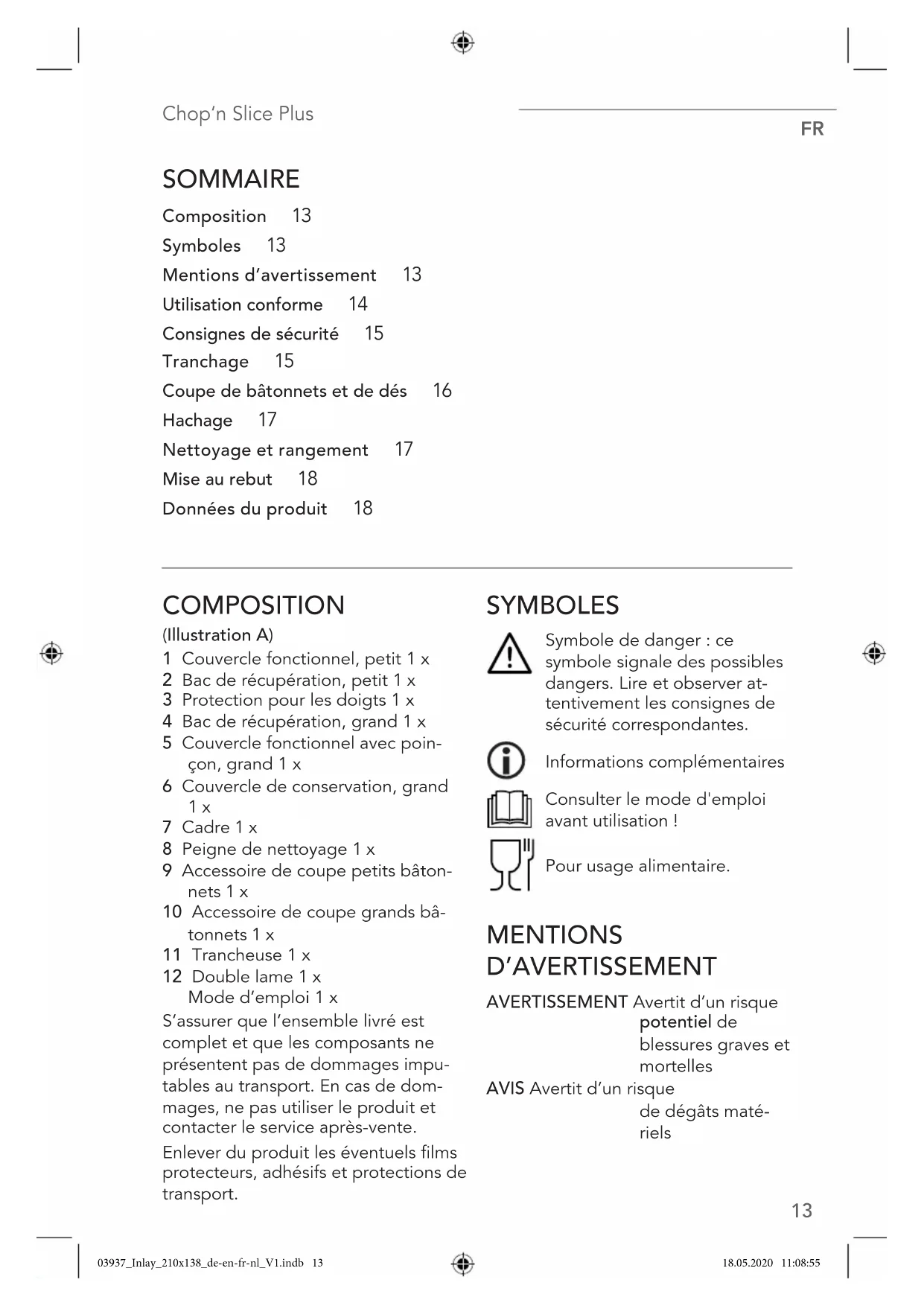 Référence article: 03937 Numéro de modèle: BG-F-00018 Contenance: Bac de récupération, grand: 1400 ml Bac de récupération, petit: 300 ml Identifiant mode d’emploi: Z 03937 M DS V1 0520 md Tous droits réservés. 03937_Inlay_210x138_de-en-fr-nl_V1.indb 1803937_Inlay_210x138_de-en-fr-nl_V1.indb 18 18.05.2020 11:08:5618.05.2020 11:08:56Chop‘n Slice Plus