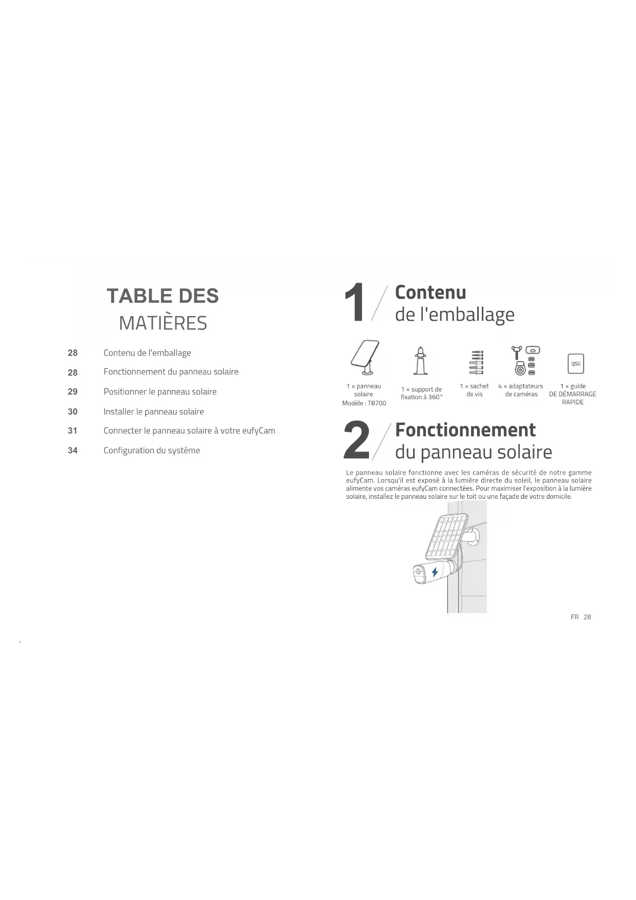 1 × panneau solaireModèle : T87001 × support de fixation à 360° Le panneau solaire fonctionne avec les caméras de sécurité de notre gamme eufyCam. Lorsqu'il est exposé à la lumière directe du soleil, le panneau solaire alimente vos caméras eufyCam connectées. Pour maximiser l'exposition à la lumière solaire, installez le panneau solaire sur le toit ou une façade de votre domicile. 1 × sachet de vis4 × adaptateursde caméras1 × guideDE DÉMARRAGE RAPIDE29 FR FR 30 Pour décider où positionner le panneau solaire, gardez les facteurs ci-après à l'esprit. Ceux-ci peuvent affecter l'efficacité du panneau solaire :