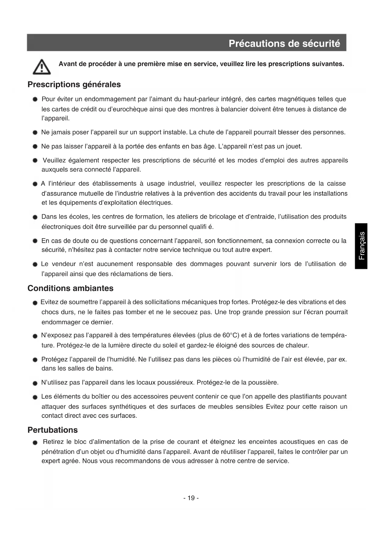 Avant de procéder à une première mise en service, veuillez lire les prescriptions suivantes. Prescriptions générales Pour éviter un endommagement par l’aimant du haut-parleur intégré, des cartes magnétiques telles que les cartes de crédit ou d’eurochèque ainsi que des montres à balancier doivent être tenues à distance de l’appareil. Ne jamais poser l’appareil sur un support instable. La chute de l’appareil pourrait blesser des personnes. Ne pas laisser l’appareil à la portée des enfants en bas âge. L’appareil n’est pas un jouet. Veuillez également respecter les prescriptions de sécurité et les modes d’emploi des autres appareils auxquels sera connecté l’appareil. A l’intérieur des établissements à usage industriel, veuillez respecter les prescriptions de la caisse d’assurance mutuelle de l’industrie relatives à la prévention des accidents du travail pour les installations et les équipements d’exploitation électriques. Dans les écoles, les centres de formation, les ateliers de bricolage et d’entraide, l’utilisation des produits électroniques doit être surveillée par du personnel qualifi é. En cas de doute ou de questions concernant l’appareil, son fonctionnement, sa connexion correcte ou la sécurité, n’hésitez pas à contacter notre service technique ou tout autre expert. Le vendeur n’est aucunement responsable des dommages pouvant survenir lors de l’utilisation de l’appareil ainsi que des réclamations de tiers. Conditions ambiantes Evitez de soumettre l’appareil à des sollicitations mécaniques trop fortes. Protégez-le des vibrations et des chocs durs, ne le faites pas tomber et ne le secouez pas. Une trop grande pression sur l’écran pourrait endommager ce dernier. N’exposez pas l’appareil à des températures élevées (plus de 60°C) et à de fortes variations de tempéra- ture. Protégez-le de la lumière directe du soleil et gardez-le éloigné des sources de chaleur. Protégez l’appareil de l’humidité. Ne l’utilisez pas dans les pièces où l’humidité de l’air est élevée, par ex. dans les salles de bains. N’utilisez pas l’appareil dans les locaux poussiéreux. Protégez-le de la poussière. Les éléments du boîtier ou des accessoires peuvent contenir ce que l’on appelle des plastifi ants pouvant attaquer des surfaces synthétiques et des surfaces de meubles sensibles Evitez pour cette raison un contact direct avec ces surfaces. Pertubations Retirez le bloc d’alimentation de la prise de courant et éteignez les enceintes acoustiques en cas de pénétration d’un objet ou d’humidité dans l’appareil. Avant de réutiliser l’appareil, faites le contrôler par un expert agrée. Nous vous recommandons de vous adresser à notre centre de service. Précautions de sécuritéFrançais