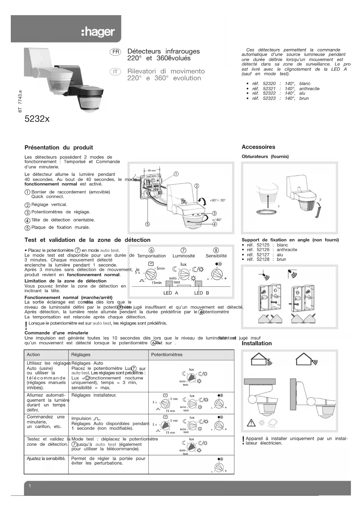 Ces détecteurs permettent la commandeautomatique d’une source lumineuse pendantune durée définie lorsqu’un mouvement estdétecté dans sa zone de surveillance. Le produitest livré avec le clignotement de la LED A inhibé(sauf en mode test).• réf. 52320 : 140°, blanc• réf. 52321 : 140°, anthracite• réf. 52322 : 140°, alu• réf. 52323 : 140°, brun