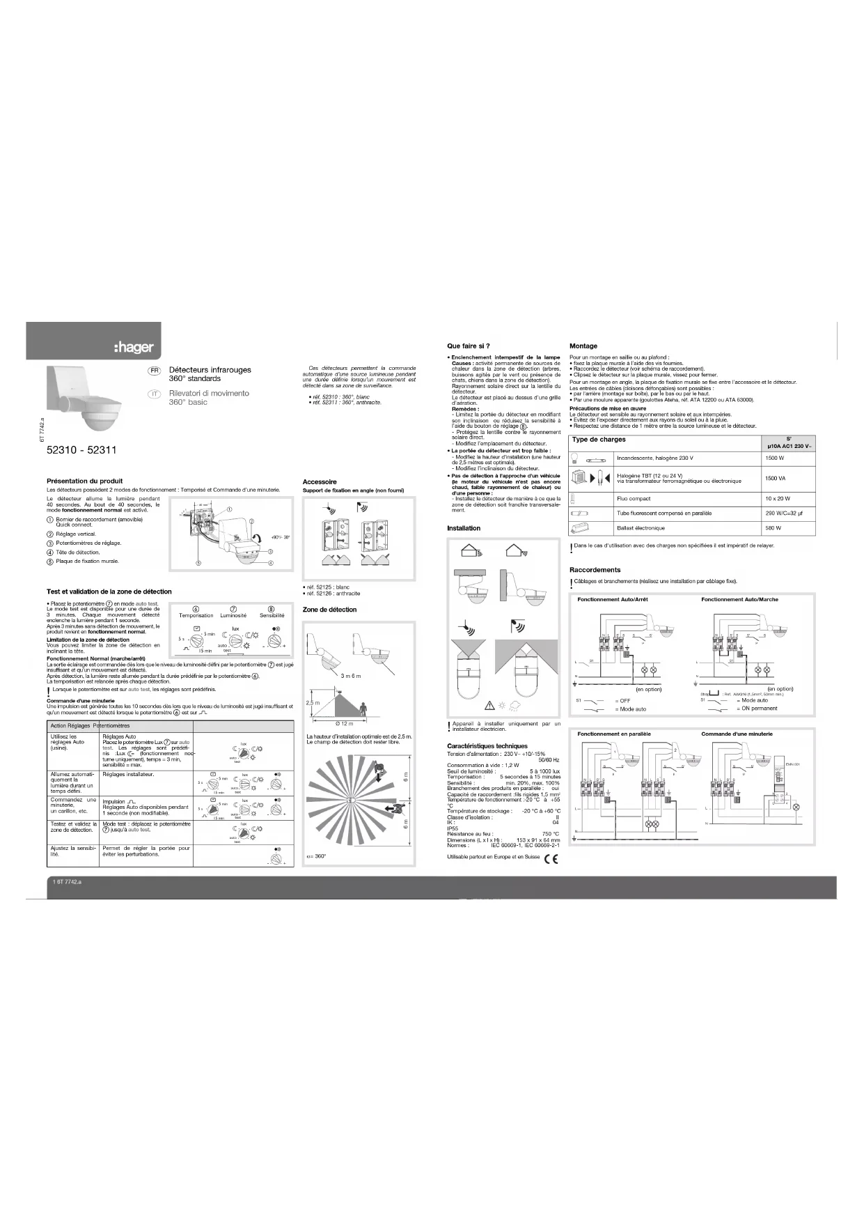 Rilevatori di movimento 360° basic 6T 7742.a 52310 - 52311 Accessoire Support de fixation en angle (non fourni)• réf. 52125 : blanc• réf. 52126 : anthracite Zone de détection 3 m 6 mLa hauteur d’installation optimale est de 2,5 m.Le champ de détection doit rester libre.α = 360° Test et validation de la zone de détection