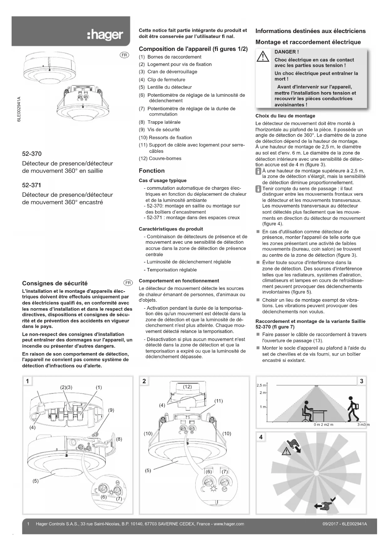 1 09/2017 - 6LE002941AHager Controls S.A.S., 33 rue Saint-Nicolas, B.P. 10140, 67703 SAVERNE CEDEX, France - www.hager.com 6LE002941A 52-370 Détecteur de presence/détecteur de mouvement 360° en saillie 52-371 Détecteur de presence/détecteur de mouvement 360° encastré