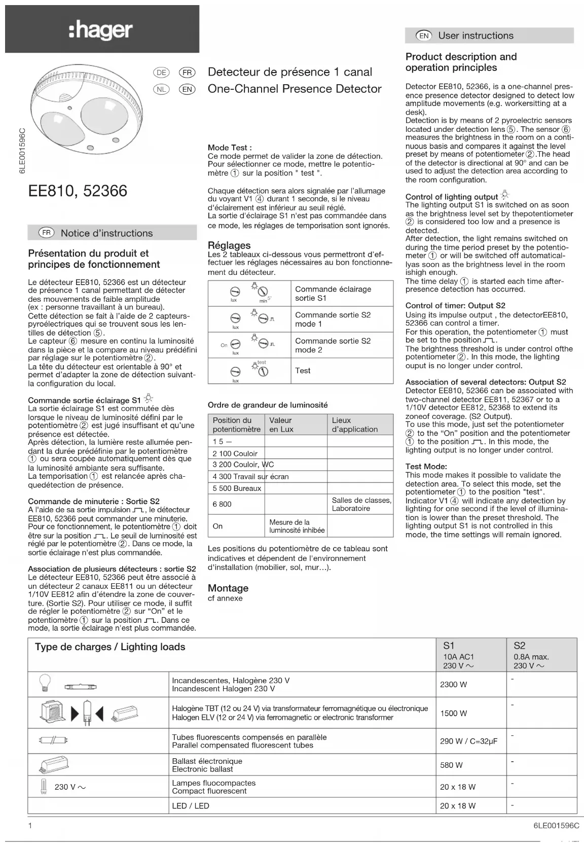 One-Channel Presence Detector Présentation du produit etprincipes de fonctionnementLe détecteur EE810, 52366 est un détecteur de présence 1 canal permettant de détecter des mouvements de faible amplitude (ex : personne travaillant à un bureau).Cette détection se fait à l’aide de 2 capteurs-pyroélectriques qui se trouvent sous les len-tilles de détection 5.Le capteur 6 mesure en continu la luminosité dans la pièce et la compare au niveau prédéfini par réglage sur le potentiomètre 2.La tête du détecteur est orientable à 90° et permet d’adapter la zone de détection suivant-la configuration du local.Commande sortie éclairage S1 :La sortie éclairage S1 est commutée dès lorsque le niveau de luminosité défini par le potentiomètre 2 est jugé insuffisant et qu’une présence est détectée.Après détection, la lumière reste allumée pen-dant la durée prédéfinie par le potentiomètre 1 ou sera coupée automatiquement dès que la luminosité ambiante sera suffisante.La temporisation 1 est relancée après cha-quedétection de présence.Commande de minuterie : Sortie S2A l'aide de sa sortie impulsion _, le détecteur EE810, 52366 peut commander une minuterie. Pour ce fonctionnement, le potentiomètre 1 doit être sur la position _. Le seuil de luminosité est réglé par le potentiomètre 2. Dans ce mode, la sortie éclairage n'est plus commandée.Association de plusieurs détecteurs : sortie S2Le détecteur EE810, 52366 peut être associé à un détecteur 2 canaux EE811 ou un détecteur 1/10V EE812 afin d’étendre la zone de couver-ture. (Sortie S2). Pour utiliser ce mode, il suffit de régler le potentiomètre 2 sur “On” et le potentiomètre 1 sur la position _. Dans ce mode, la sortie éclairage n'est plus commandée.Mode Test :Ce mode permet de valider la zone de détection.Pour sélectionner ce mode, mettre le potentio-mètre 1 sur la position " test ".Chaque détection sera alors signalée par l’allumage du voyant V1 4 durant 1 seconde, si le niveau d'éclairement est inférieur au seuil réglé.La sortie d'éclairage S1 n'est pas commandée dans ce mode, les réglages de temporisation sont ignorés.RéglagesLes 2 tableaux ci-dessous vous permettront d’ef-fectuer les réglages nécessaires au bon fonctionne-ment du détecteur.Ordre de grandeur de luminositéLes positions du potentiomètre de ce tableau sont indicatives et dépendent de l'environnement d'installation (mobilier, sol, mur…).Montagecf annexeProduct description andoperation principlesDetector EE810, 52366, is a one-channel pres-ence presence detector designed to detect low amplitude movements (e.g. workersitting at a desk).Detection is by means of 2 pyroelectric sensors located under detection lens 5. The sensor 6 measures the brightness in the room on a conti-nuous basis and compares it against the level preset by means of potentiometer 2.The head of the detector is directional at 90° and can be used to adjust the detection area according to the room configuration.Control of lighting output :The lighting output S1 is switched on as soon as the brightness level set by thepotentiometer 2 is considered too low and a presence is detected. After detection, the light remains switched on during the time period preset by the potentio-meter 1 or will be switched off automatical-lyas soon as the brightness level in the room ishigh enough. The time delay 1 is started each time after-presence detection has occurred.Control of timer: Output S2Using its impulse output , the detectorEE810, 52366 can control a timer.For this operation, the potentiometer 1 must be set to the position _.The brightness threshold is under control ofthe potentiometer 2. In this mode, the lighting ouput is no longer under control.Association of several detectors: Output S2Detector EE810, 52366 can be associated with two-channel detector EE811, 52367 or to a 1/10V detector EE812, 52368 to extend its zoneof coverage. (S2 Output). To use this mode, just set the potentiometer 2 to the “On” position and the potentiometer 1 to the position _. In this mode, the lighting output is no longer under control.Test Mode:This mode makes it possible to validate the detection area. To select this mode, set the potentiometer 1 to the position "test".Indicator V1 4 will indicate any detection by lighting for one second if the level of illumina-tion is lower than the preset threshold. The lighting output S1 is not controlled in this mode, the time settings will remain ignored.