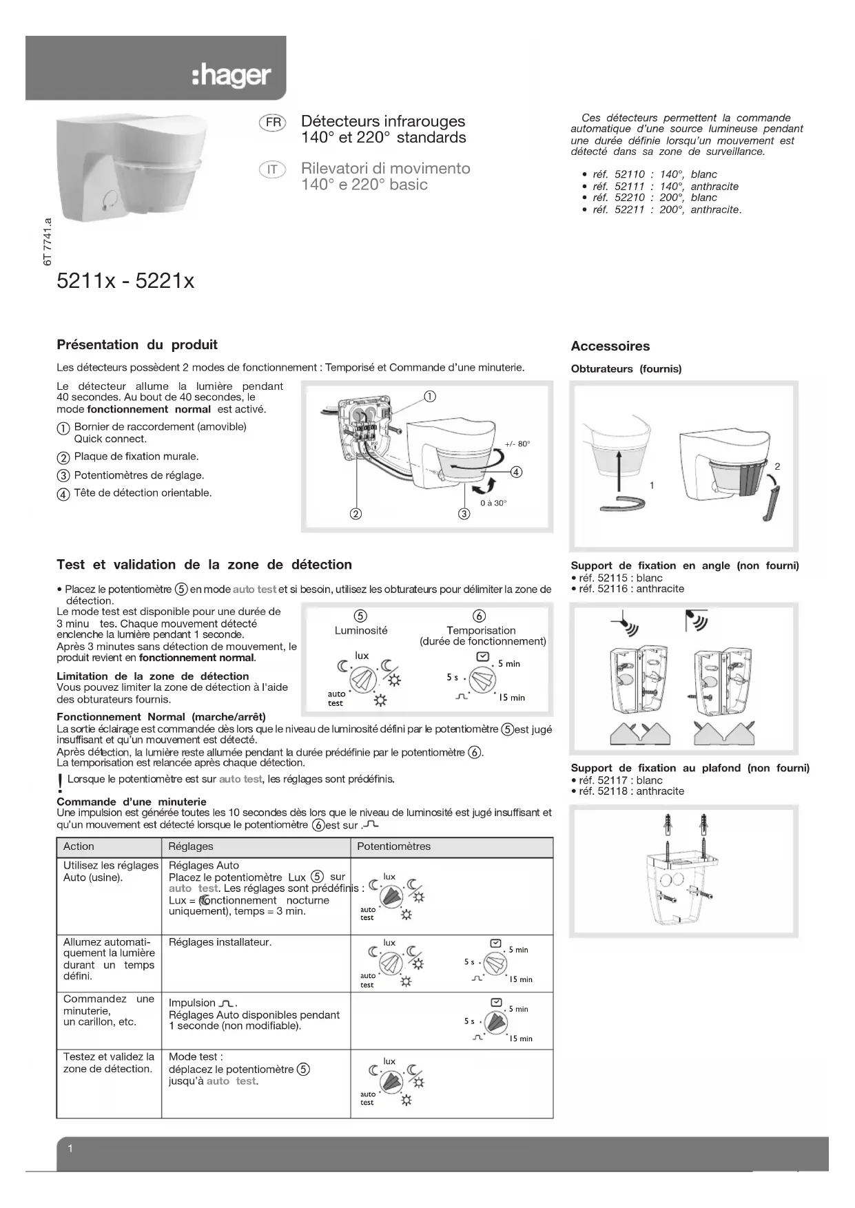 5211x - 5221x Ces détecteurs permettent la commandeautomatique d’une source lumineuse pendantune durée définie lorsqu’un mouvement estdétecté dans sa zone de surveillance.• réf. 52110 : 140°, blanc• réf. 52111 : 140°, anthracite• réf. 52210 : 200°, blanc• réf. 52211 : 200°, anthracite.