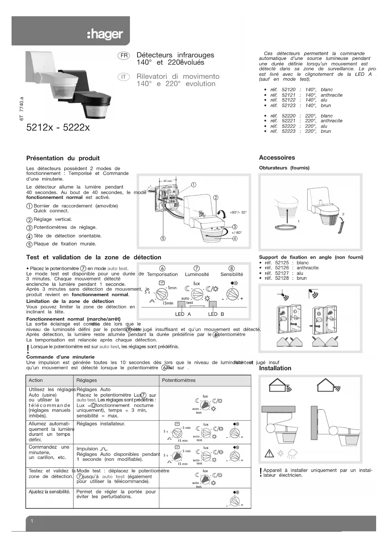 Questo rilevatore permette il comando auto-matico d’una sorgente luminosa per un periododefinito quando un movimento è segnalatonella sua zona di sorveglianza. Il prodotto vienefornito con inibizione (salvo modo test) dilampeggio del LED A.• rif. 52120 : 140°, bianco• rif. 52121 : 140°, anthracite• rif. 52122 : 140°, alu• rif. 52123 : 140°, marrone• rif. 52220 : 220°, bianco• rif. 52221 : 220°, anthracite• rif. 52222 : 220°, alu• rif. 52223 : 220°, marrone