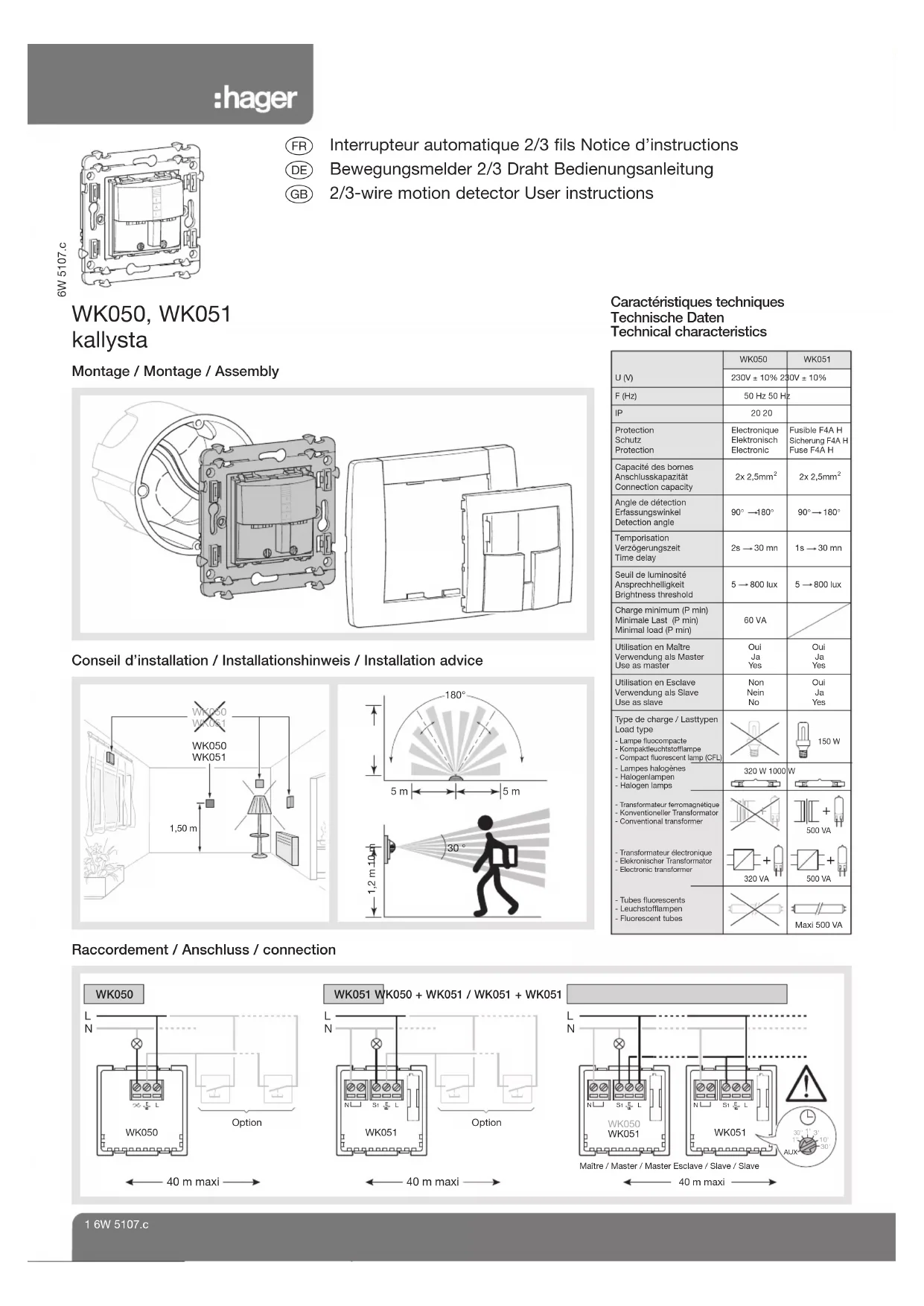 40 m maxi30''1'3'10' AUX 30'1'' WK050WK051WK050WK0511,50 m 30 °180°1,2 m 10 m 5 m 5 m WK050 WK051 WK050 + WK051 / WK051 + WK051Hager SAS - 132 bld d’Europe - BP 78 - 67 212 Obernai cedex (FRANCE) - Tél. +333 88 49 50 50 - www.hagergroup.net2 Hager 10.2009 6W 5107.c Description du produit : Interrupteurs automatiques WK050 / WK051 adaptés à des applications intérieures de type circulation : couloirs, hall d’entrée... Extension de la zone de détection à l’aide d’un deuxième détecteur de type WK051 (fonctionnement maître / esclave). Mise en oeuvre : Limitation de la zone de détection : Utiliser les 2 molettes de réglage (5). Pour faciliter ce réglage, placer les potentiomètres (3) et (6) sur “TEST” (seuil de luminosité désactivé, temporisation = 2s). Réglage du seuil de luminosité : - Manuel : par potentiomètre (3). - Automatique : appui long sur le bouton (2); relâcher quand le voyant jaune clignote. Le seuil correspond à la luminosité ambiante du moment (pas accessible en position “AUX” sur le WK051). Extension de la zone de détection : Fonctionnement maître / esclave (exple : couloir). Les WK050 et WK051 peuvent être utilisés en tant que maître en connectant sur leur entrée E des interrupteurs automatiques 3 fils WK051. Attention : placer sur “AUX” le potentiomètre (6) quand le WK051 est utilisé en esclave (voir câblage). Dans le mode “AUX” le bouton (2) du WK051 n’est plus actif. Allumage déporté : Possibilité de connecter sur l’entrée E des boutons poussoirs à fermeture pour forcer l’allumage (voir câblage). Utilisation : Choix du mode par appuis brefs sur le bouton (2) : - Arrêt forcé : voyant rouge (0) allumé. - Mode automatique : voyant jaune (A) allumé, déclenchement si détection de passage et luminosité inférieure au seuil. - Marche forcée : voyant vert (1) allumé. Autres fonctions : - Forçage temporaire : lumière active 2h puis retour en mode automatique. - Appui long (3s) sur le bouton (2), relâcher quand le voyant rouge clignote; le voyant vert (1) devient clignotant. Egalement accessible par un appui de 3 secondes sur le poussoir connecté sur l’entrée E. - Retour au mode automatique par un appui bref sur le bouton (2) ou sur le poussoir connecté sur l’entrée E. - Sécurité : ce mode permet de désactiver le bouton (2) (exple : lieu public). 1 : Choisir le mode de fonctionnement Arrêt / Auto / Marche forcée. 2 : Appui long (10s) sur (2), relâcher quand le voyant vert clignote. 3 : Pour annuler le mode sécurité : appui long (10s) sur (2), relâcher quand le voyant vert clignote. Précaution d’emploi : - Après la mise sous tension, les capteurs sont inhibés pendant 30s et la lumière est active durant 2 minutes. - Les boutons poussoirs (esclaves) peuvent être lumineux si les voyants sont connectés au neutre. - Conservation du mode de fonctionnement et du seuil de luminosité après coupure d’alimentation électrique. Product description: Motion detectors WK050 / WK051 meant for indoor applications: corridors, reception halls... Extension of detection area through detectors WK051 (master / slave working). Implementation: Limitation of detection area: Use both adjusting knobs (5). To make easier the adjustment, put the potentiometers (3) & (6) at "Test" (brightness threshold deactivated, time delay = 2s). Adjustment of brightness threshold: - Manual: through potentiometer (3). - Automatic: long press (6s) on button (2), release when yellow indicator is blinking. The threshold corresponds to the current room brightness. (not accessible in position " AUX " for the WK051). Extension of detection area: Master/slave working (ex: corridor). The WK050 et WK051 can be used as master by connecting 3 wire-motion detectors WK051 on their input. Caution: - Put the potentiometer (6) at "AUX" when the WK051 is used as slave (see wiring). - In the mode "AUX", the button (2) of the WK051 is no more active. Carried off switching on: Possibility to connect closing push buttons on input E to force the switching on (see wiring). Use: Selection of mode through short presses on button (2): Forced switching off: red indicator (0) switched on. Automatic mode: yellow indicator (A) switched-on, release when passage detection, and brightness lower than threshold. Forced switching on: green indicator (1) switched on. Other functions: Temporary forcing: light on during 2h then return to automatic mode. - Long press (3s) on button (2), release when red indicator is blinking; green indicator (1) becomes blinking. Also accessible by pressing 3 seconds on push button connected on input E. - Return to automatic mode though short press on button (2) or on push button connected to input E (not 3s). Security: This mode enables to deactivate the button (2) - ex: public place. - Select working mode Switching off/Auto/Forced switching on. - Long press (10s) on (2), release when green indicator is blinking. - To cancel security mode: long press (10s) on (2), release when green indicator is blinking. Precautions for use: - After switching on, the sensors are inhibited during 30s and the light is switched on during 2 minutes. - The push buttons (slaves) can be luminous when the indicators are connected to the neutral. - Conservation of mode of operation and of brightness threshold after circuit-breaking.