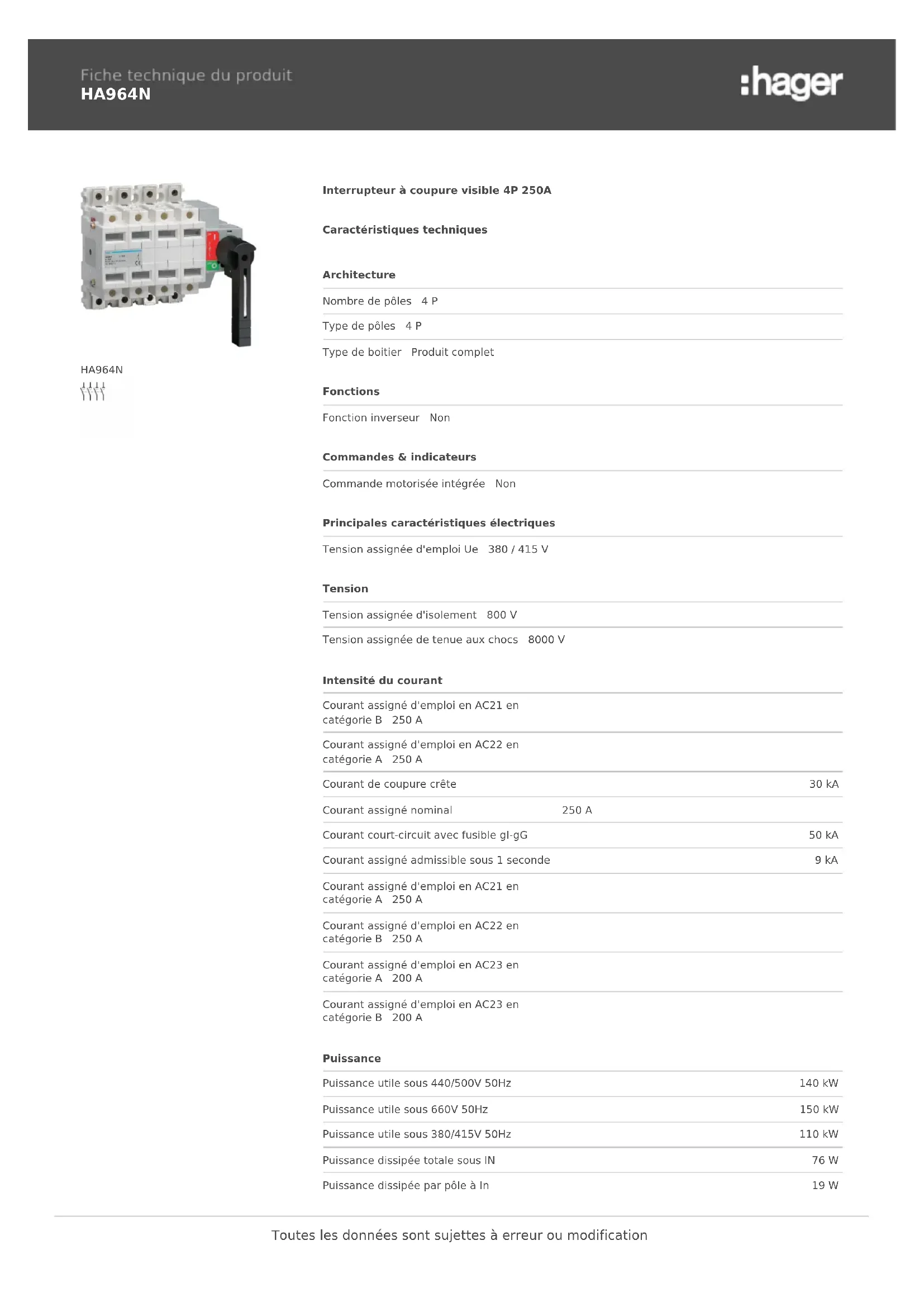 HA964N HA964N Interrupteur à coupure visible 4P 250A Caractéristiques techniques Architecture Nombre de pôles 4 P Type de pôles 4 P Type de boitier Produit complet Fonctions Fonction inverseur Non Commandes & indicateurs Commande motorisée intégrée Non Principales caractéristiques électriques Tension assignée d'emploi Ue 380 / 415 V Tension Tension assignée d'isolement 800 V Tension assignée de tenue aux chocs 8000 V Intensité du courant Courant assigné d'emploi en AC21 en catégorie B 250 A Courant assigné d'emploi en AC22 en catégorie A 250 A Courant de coupure crête 30 kA Courant assigné nominal 250 A Courant court-circuit avec fusible gI-gG 50 kA Courant assigné admissible sous 1 seconde 9 kA Courant assigné d'emploi en AC21 en catégorie A 250 A Courant assigné d'emploi en AC22 en catégorie B 250 A Courant assigné d'emploi en AC23 en catégorie A 200 A Courant assigné d'emploi en AC23 en catégorie B 200 A Puissance Puissance utile sous 440/500V 50Hz 140 kW Puissance utile sous 660V 50Hz 150 kW Puissance utile sous 380/415V 50Hz 110 kW Puissance dissipée totale sous IN 76 W Puissance dissipée par pôle à In 19 W Toutes les données sont sujettes à erreur ou modificationPuissance d'emploi à 400V en AC1 164 kW Porte, couvercle Cadenassable Oui Connexion Section de raccordement en câble rigide 150 mm² Type de connexion plage de raccordement Equipement Nombre contact auxiliaire à ouverture 0 Nombre contact auxiliaire à fermeture 0 Nombre contact auxiliaire inverseur 0 Commande motorisée optionnelle Non Standards Directive européenne WEEE concerné Sécurité Indice de protection IP IP00 Toutes les données sont sujettes à erreur ou modification