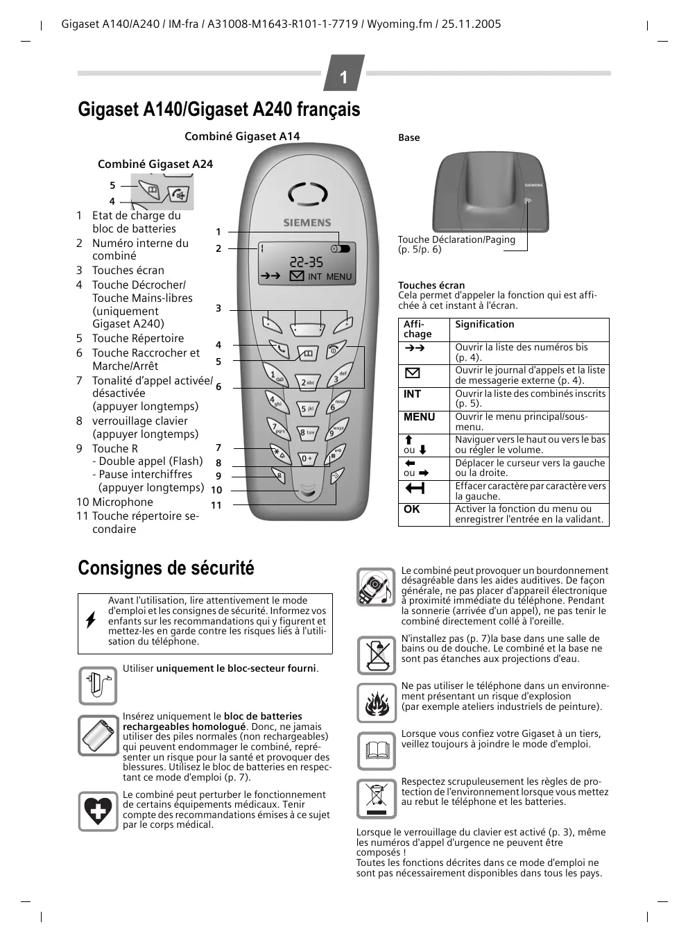 Lorsque vous confiez votre Gigaset à un tiers, veillez toujours à joindre le mode d'emploi. Respectez scrupuleusement les règles de protection de l'environnement lorsque vous mettez au rebut le téléphone et les batteries. Lorsque le verrouillage du clavier est activé (p. 3), même les numéros d'appel d'urgence ne peuvent être composés ! Toutes les fonctions décrites dans ce mode d'emploi ne sont pas nécessairement disponibles dans tous les pays. Gigaset A140/A240 / IM-fra / A31008-M1643-R101-1-7719 / Wyoming.fm / 25.11.2005